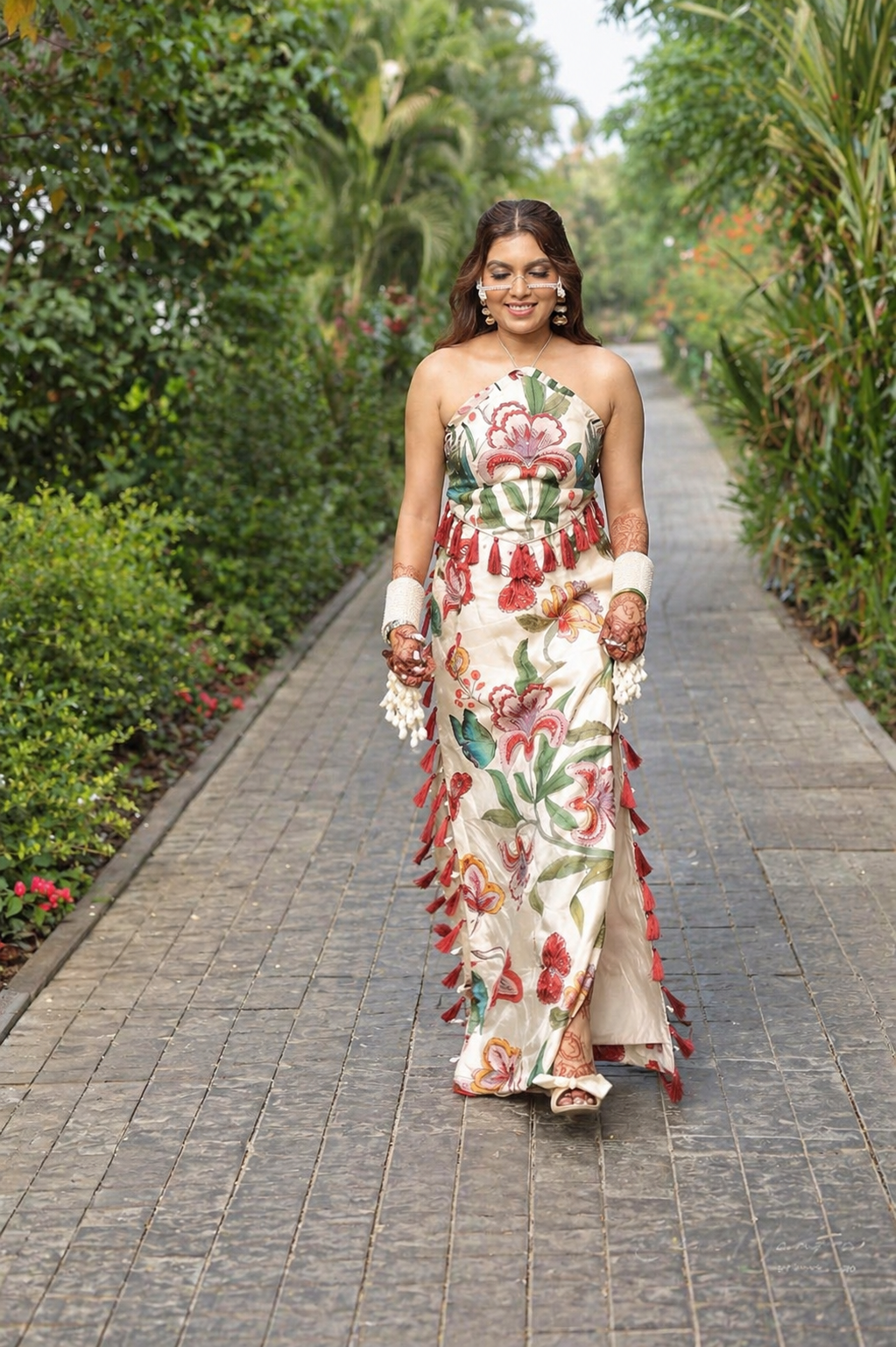 Description This outfit is a statement ivory draped saree-style gown featuring bold multicolor floral embroidery. It...