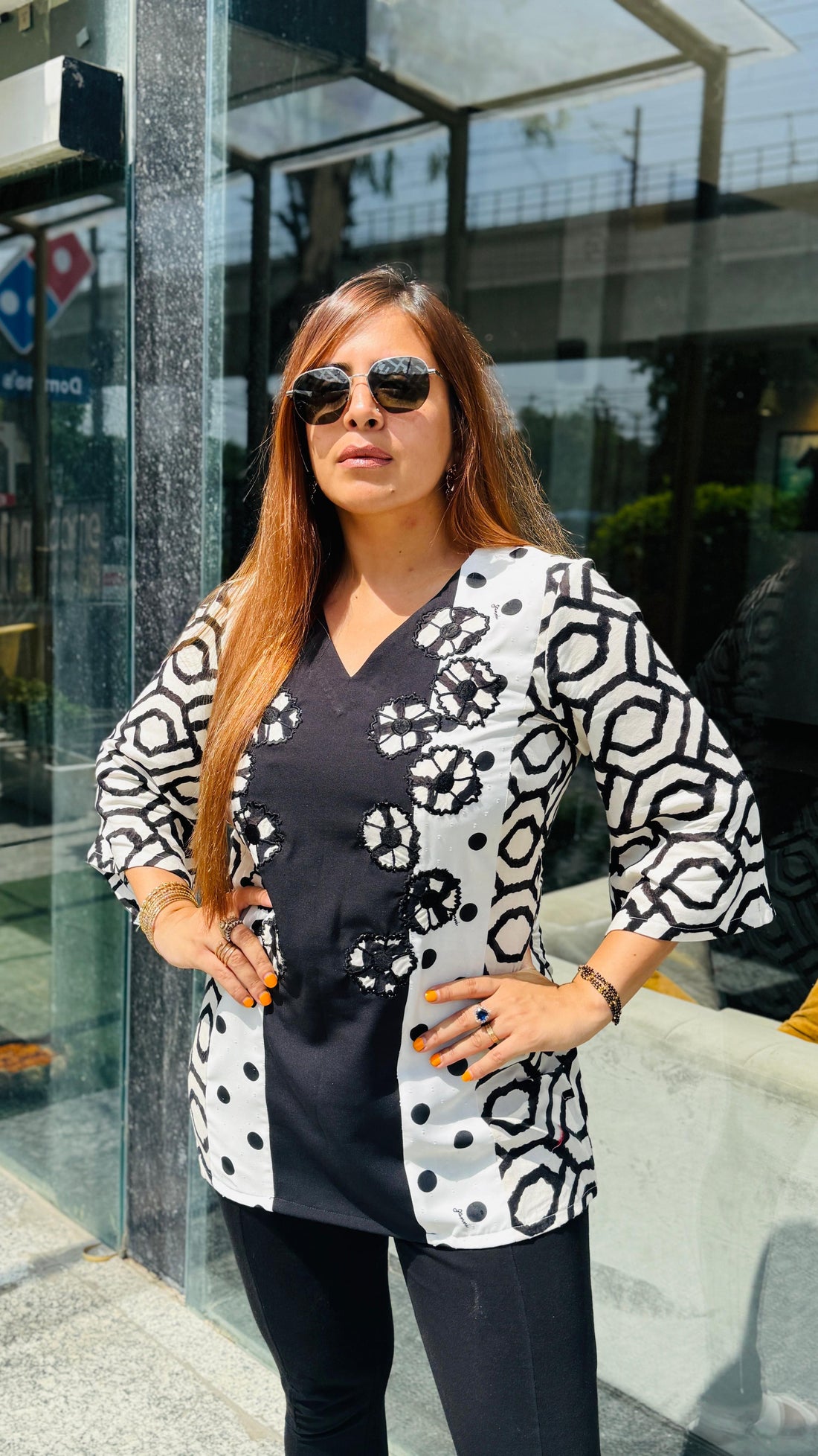 Description Step into effortless style with this black and white cotton top, designed with a...