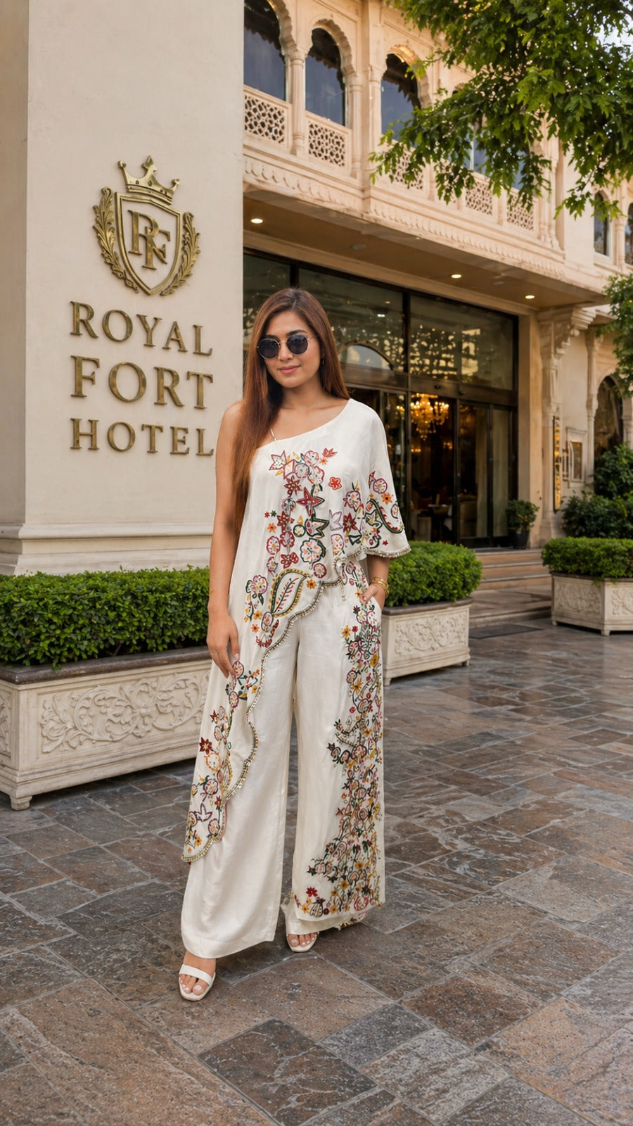 Description This outfit features a breezy ivory co-ord set with intricate multicolor floral embroidery. The...