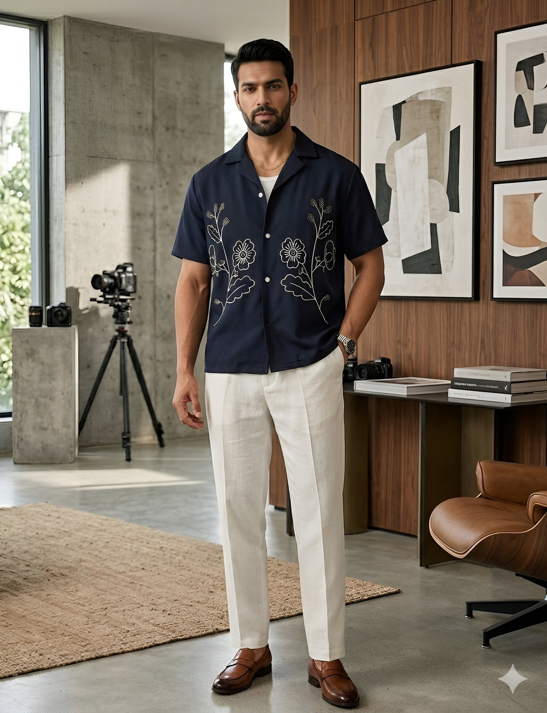 Men’s Navy Blue Cotton Embroidered Summer Shirt