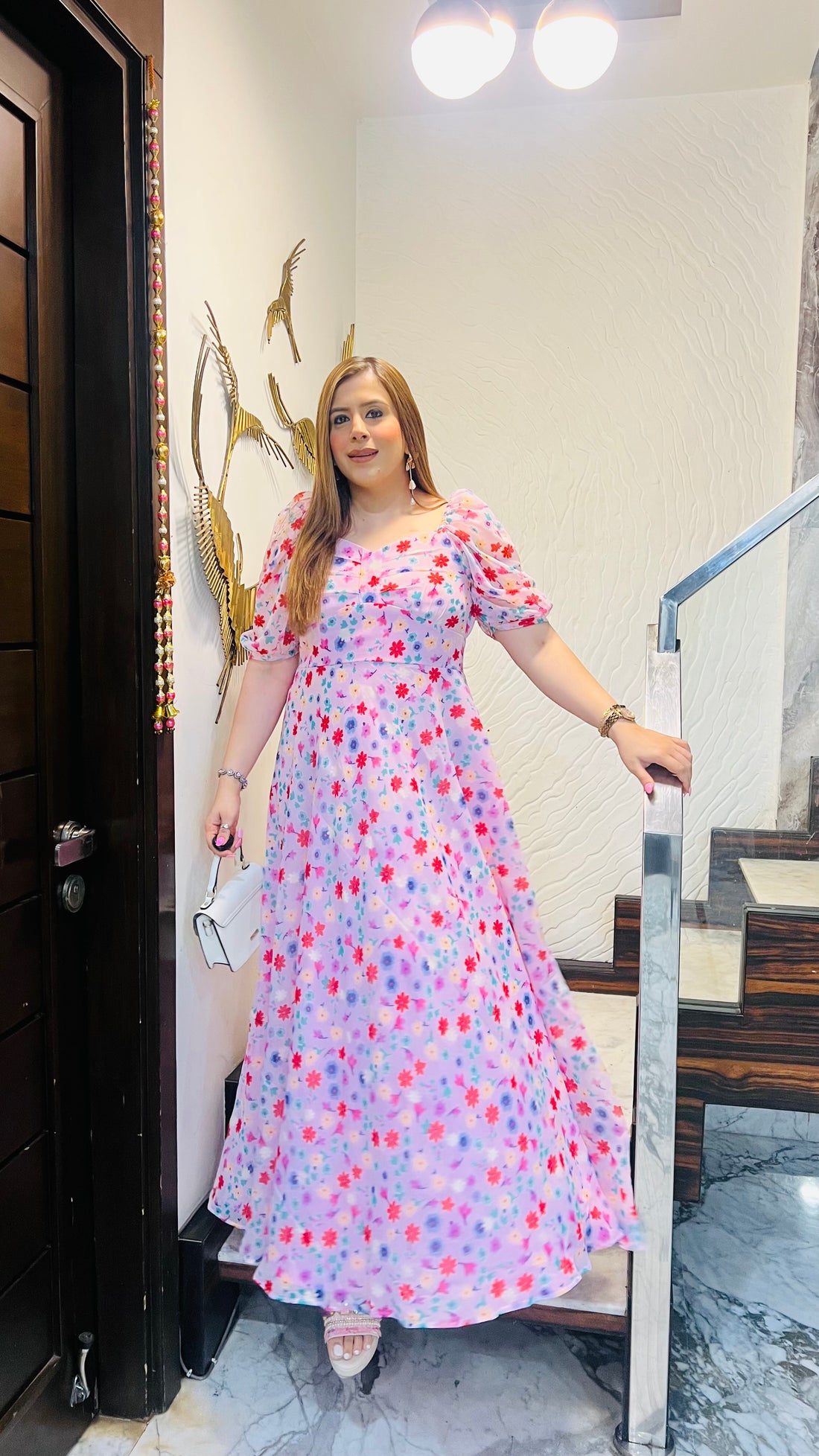 Description A dreamy baby pink floral maxi dress 🌸 with delicate puff sleeves, a sweetheart...
