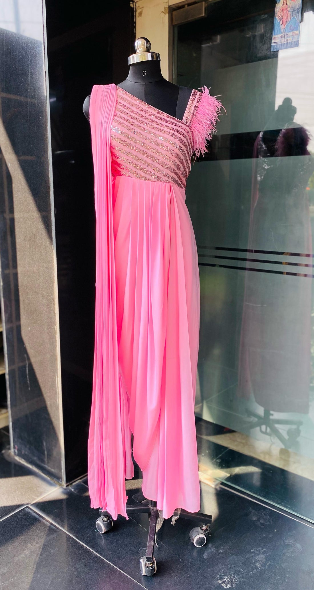 Description Elegant enchantment in baby pink: this cocktail drape is the epitome of sophistication for...