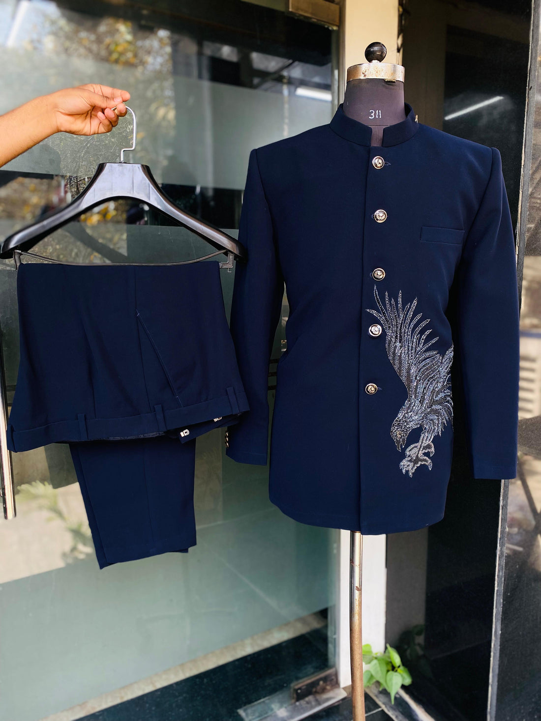 Description Effortless elegance meets meticulous craftsmanship in the navy blue embroidered blazer set - your...