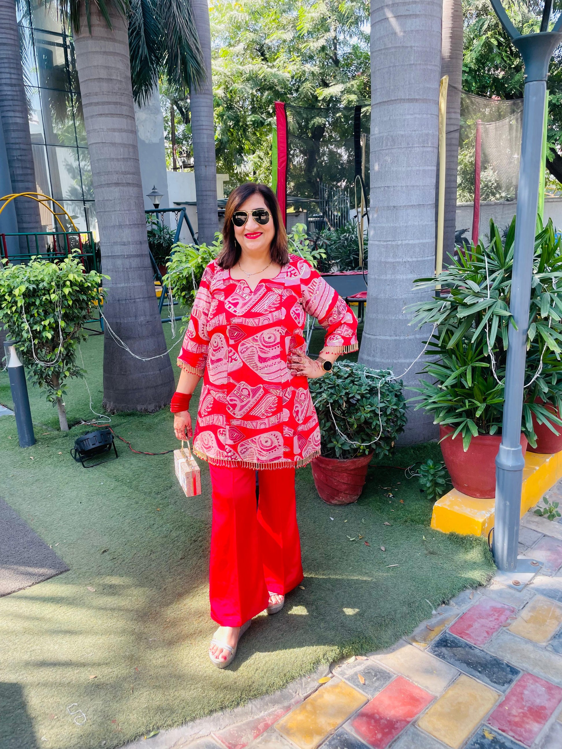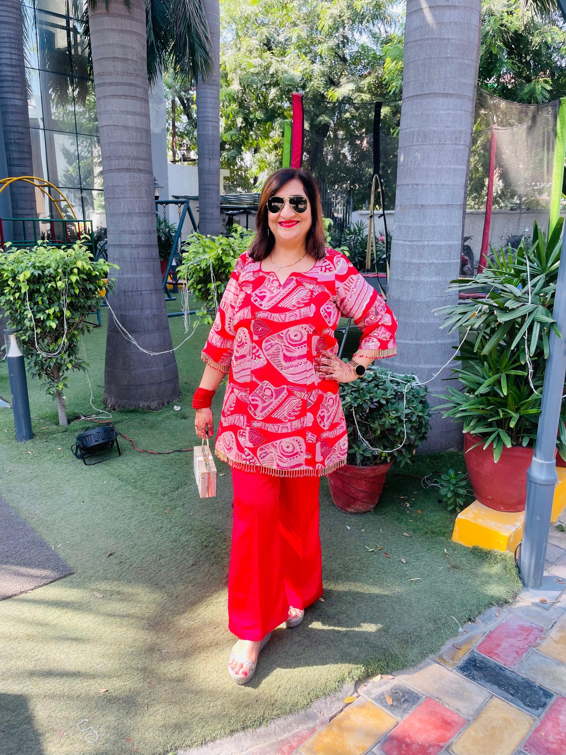 Vibrant Cherry Red Festive Co-Ord 🌺 with bold traditional patterns, fringed hemline, and matching Bellbottom pants. Perfect for festive occasions 🎉, offering style and comfort with a chic ethnic flair ✨. |