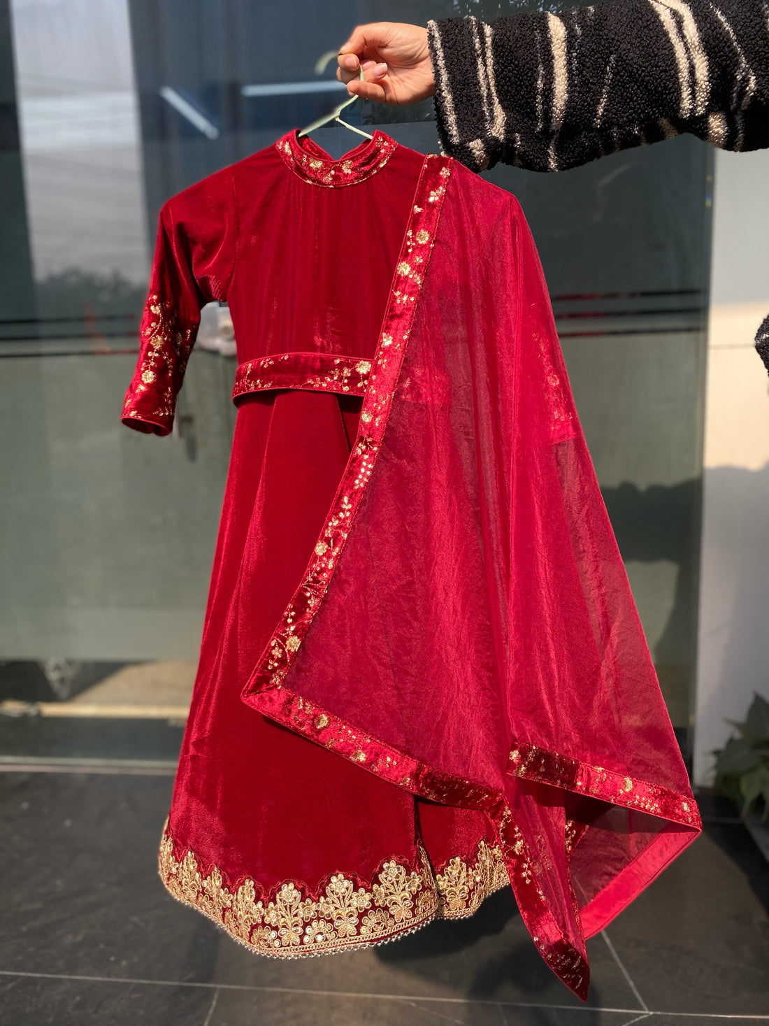 Description Let your child enchant in the luxurious softness of maroon velvet, a gown that...
