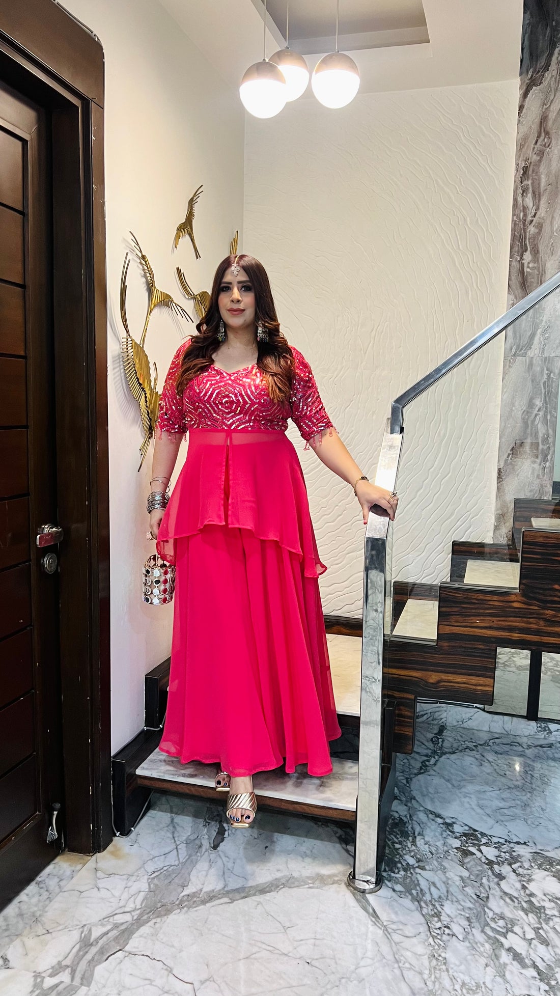 Description "This stunning hot pink mirror garara suit features intricate mirror work, flowing layers, and...