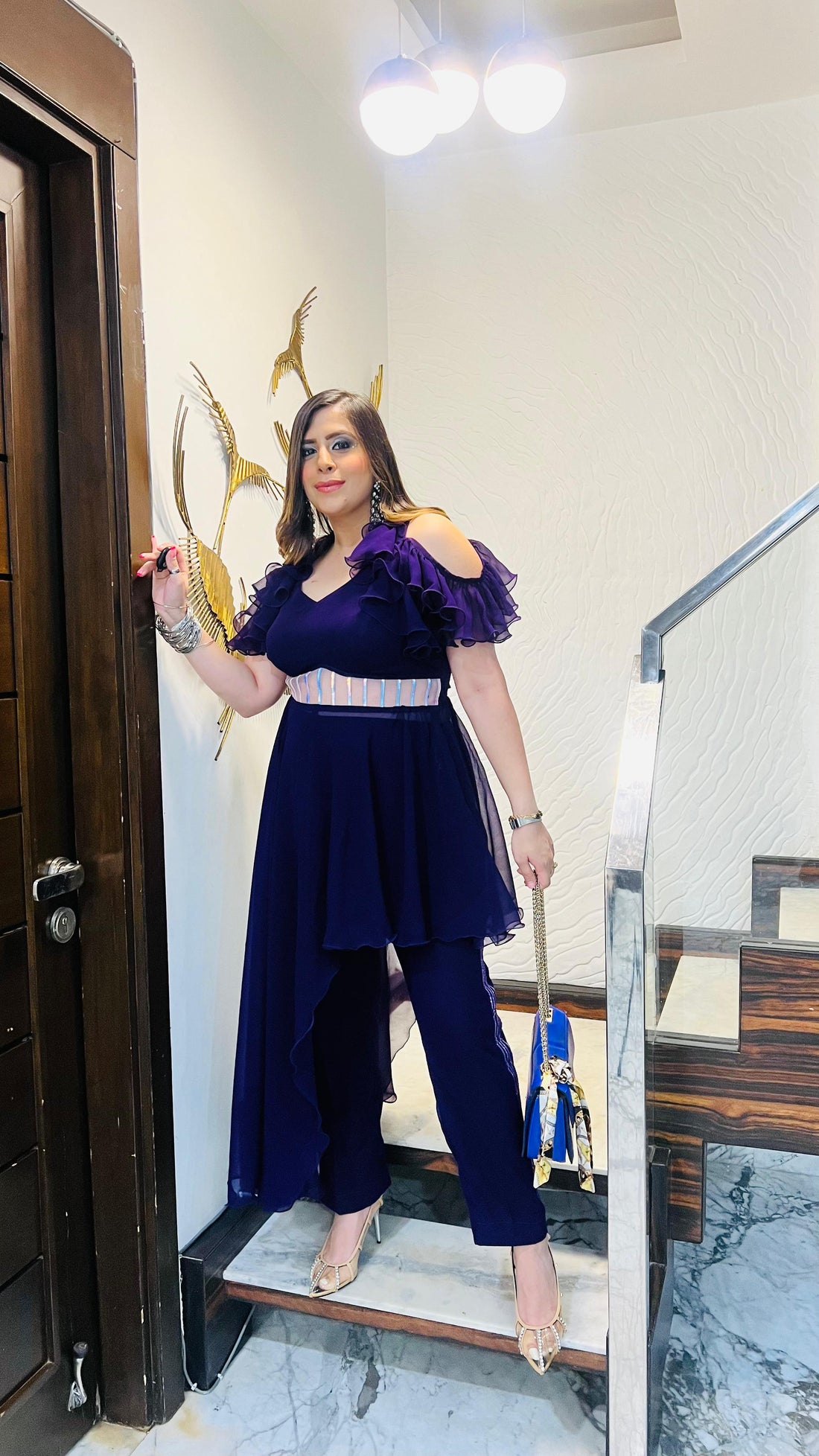 Description "Exude elegance in this dark purple suit, adorned with intricate embroidery and delicate ruffles....
