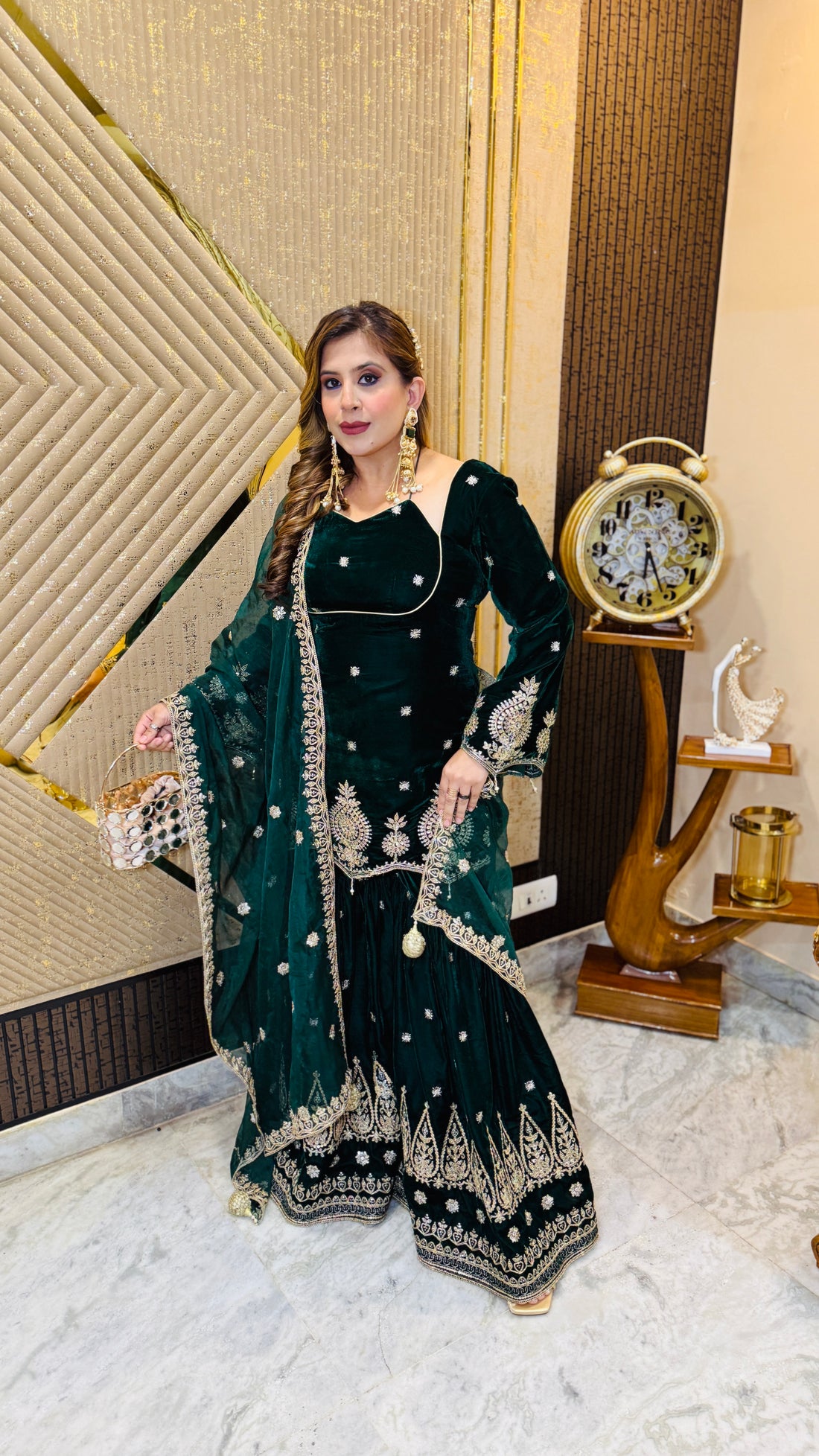 Description Elevate your winter festive wardrobe with the Sufi Night Velvet Garara Suit from Lakhina...