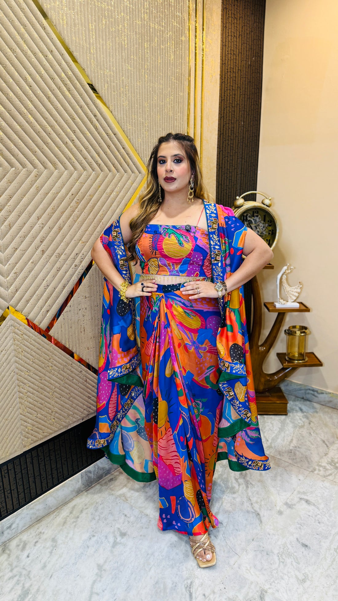 Discription Add a burst of colour to your occasion wardrobe with this striking Indo-Western drape...