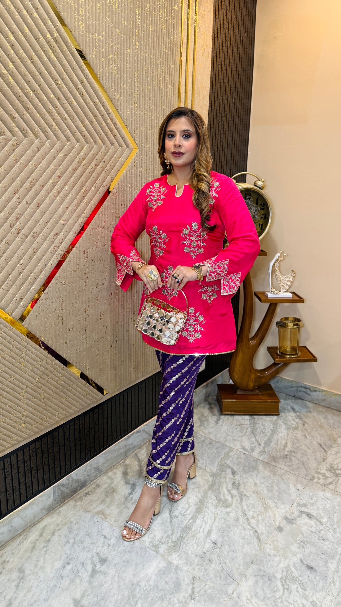 Description This vibrant ethnic outfit features a bright pink kurta adorned with intricate gold embroidery,...