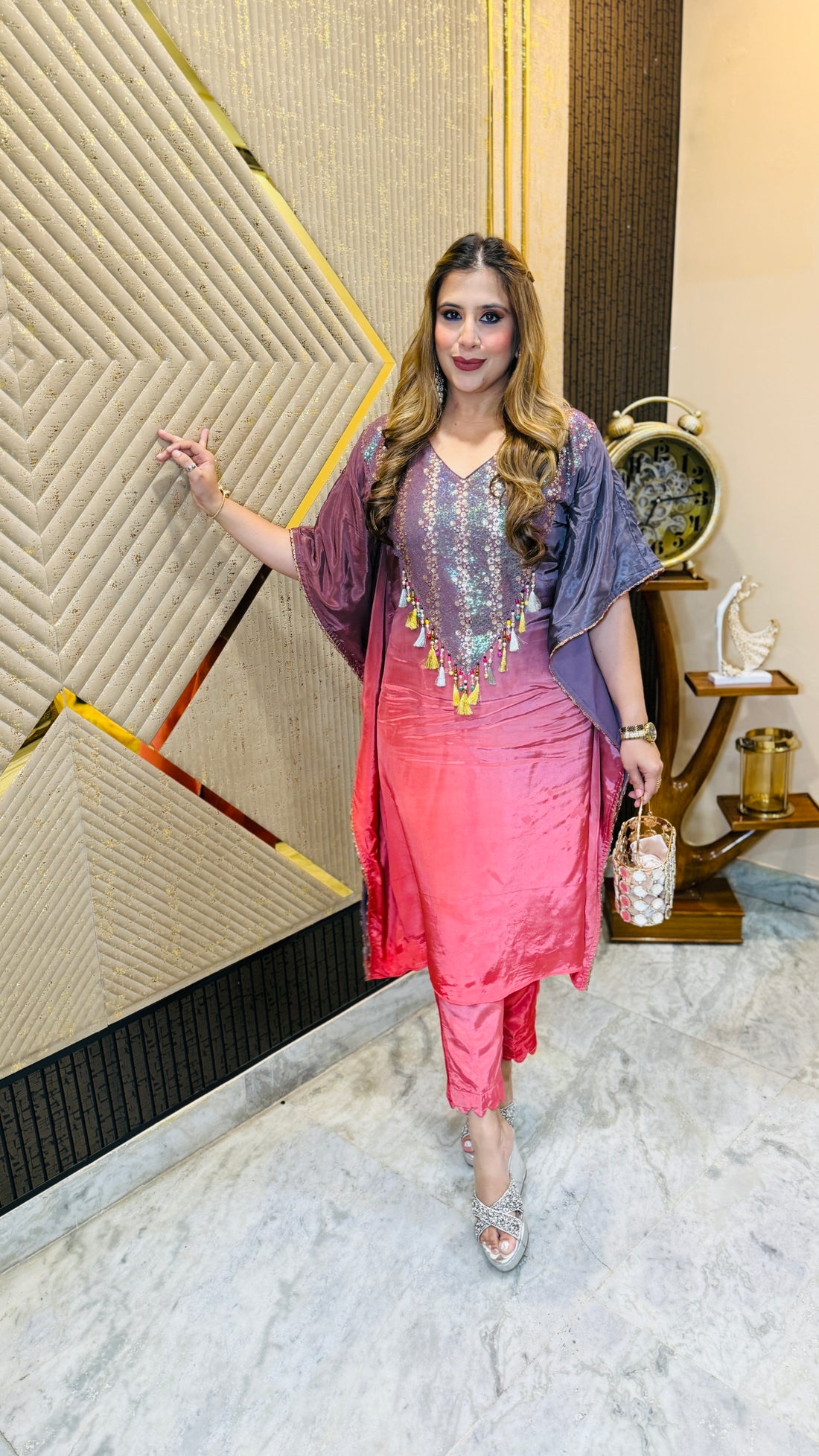 Description This elegant ethnic outfit features a rich mauve and rose-pink color palette with a...