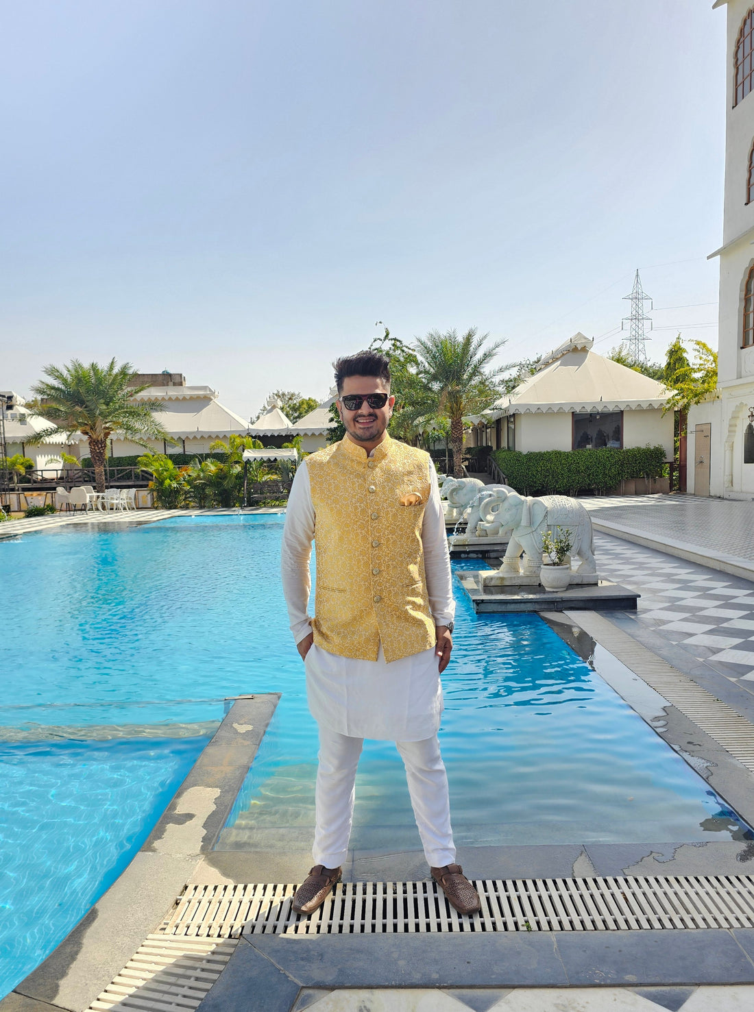 Description Drape yourself in opulence with this golden yellow Banarasi waistcoat, where tradition meets modern...