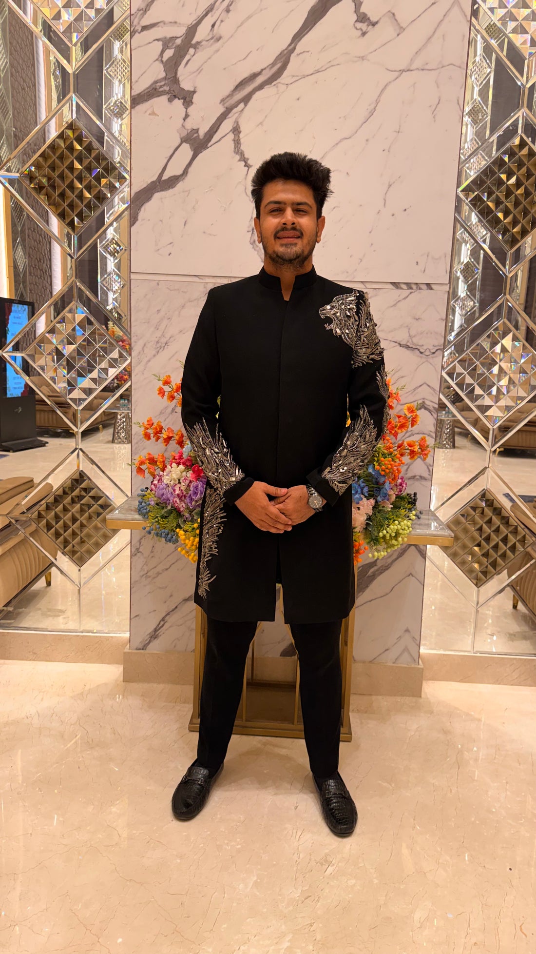 Description A sleek black sherwani featuring intricate silver embroidery — perfectly blending traditional craftsmanship with...