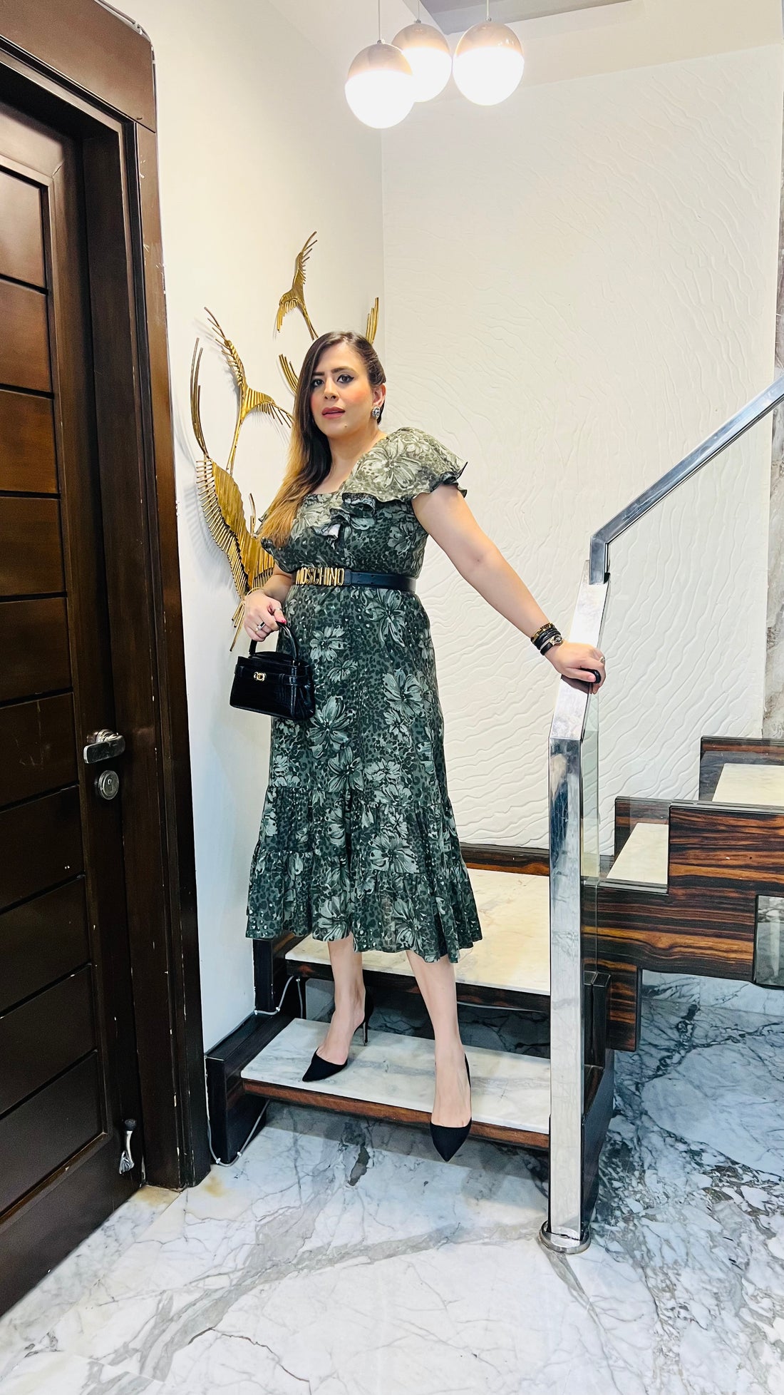 Description The Geometri-City Midi Dress features bold navy-black geometric patterns 🖤💙, puff sleeves, a square...