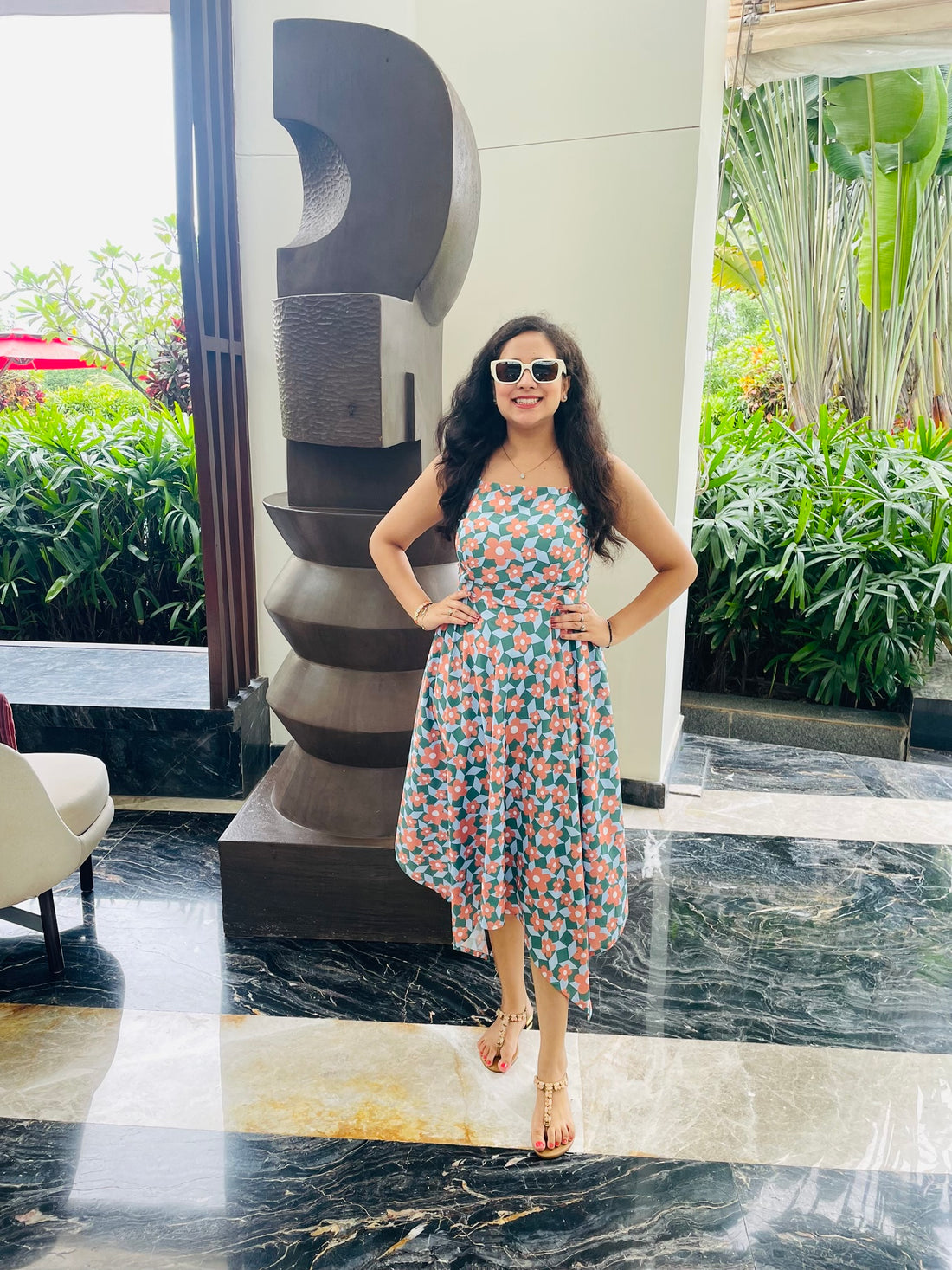Description A stunning teal lurex midi dress adorned with vibrant floral prints and delicate ruching....