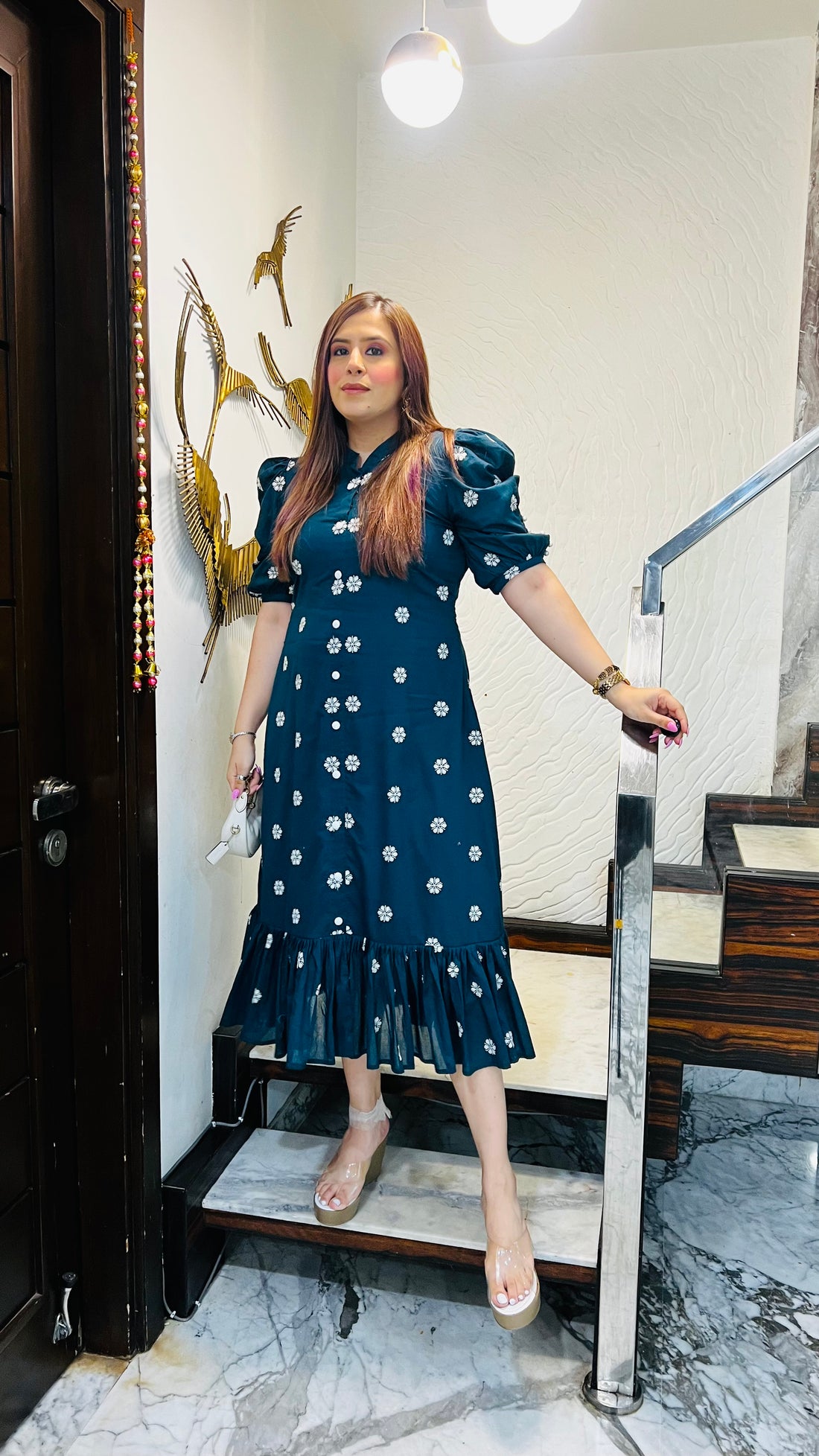Description The Peacock Embroidered Cotton Midi Dress 🦚✨ flaunts elegant white floral embroidery on a...