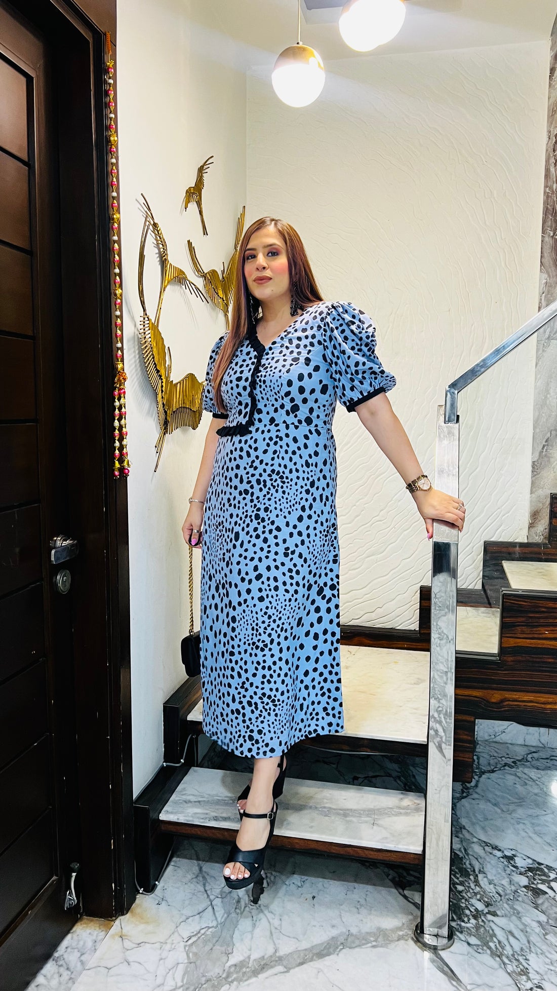 Description The Ocean Blue Cotton Midi Dress 🌊💙 features playful black polka dots 🖤 and...