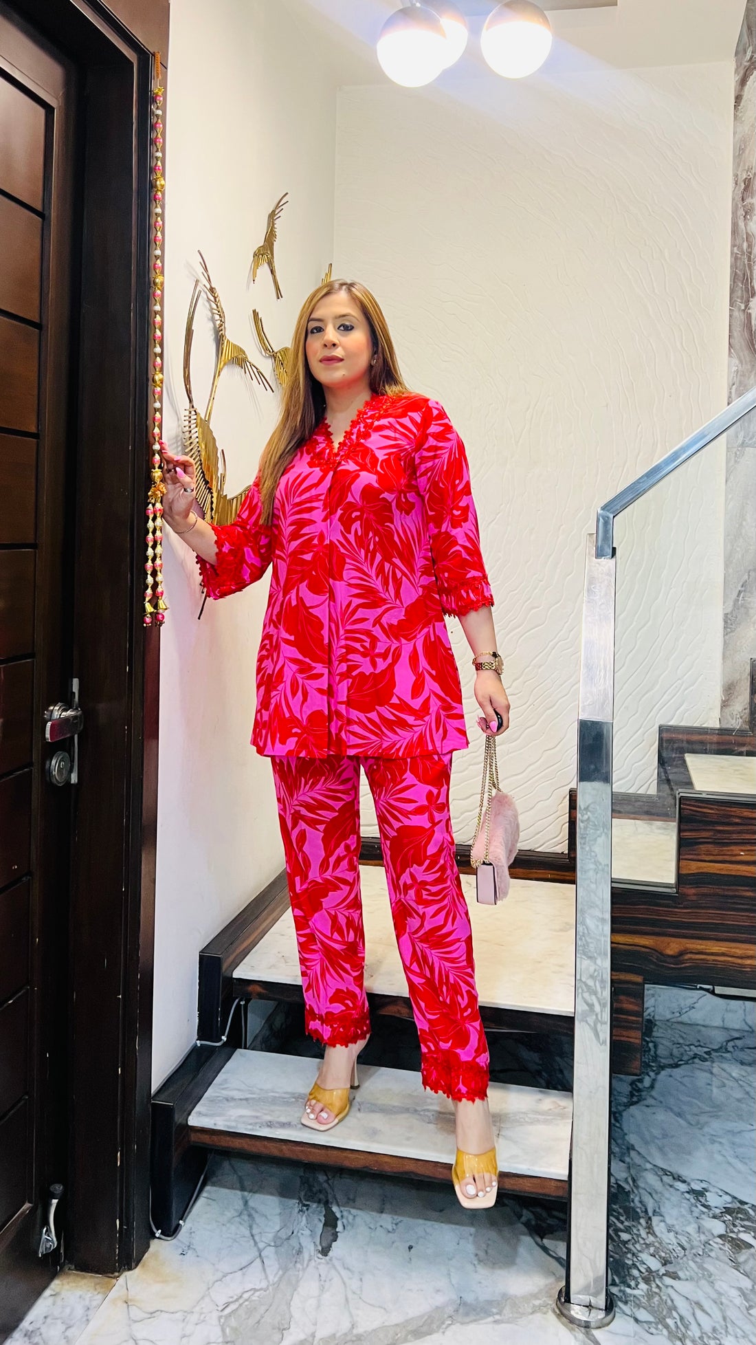 Description The Pink Flower Cotton Co-Ord 🌺✨ is a vibrant red and pink floral set...