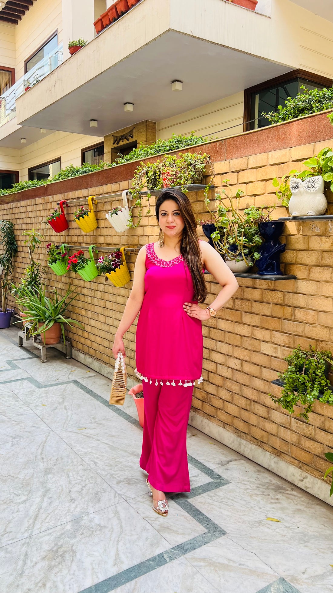 Description Step into festive charm with this vibrant pink co-ord set 💖, adorned with golden...