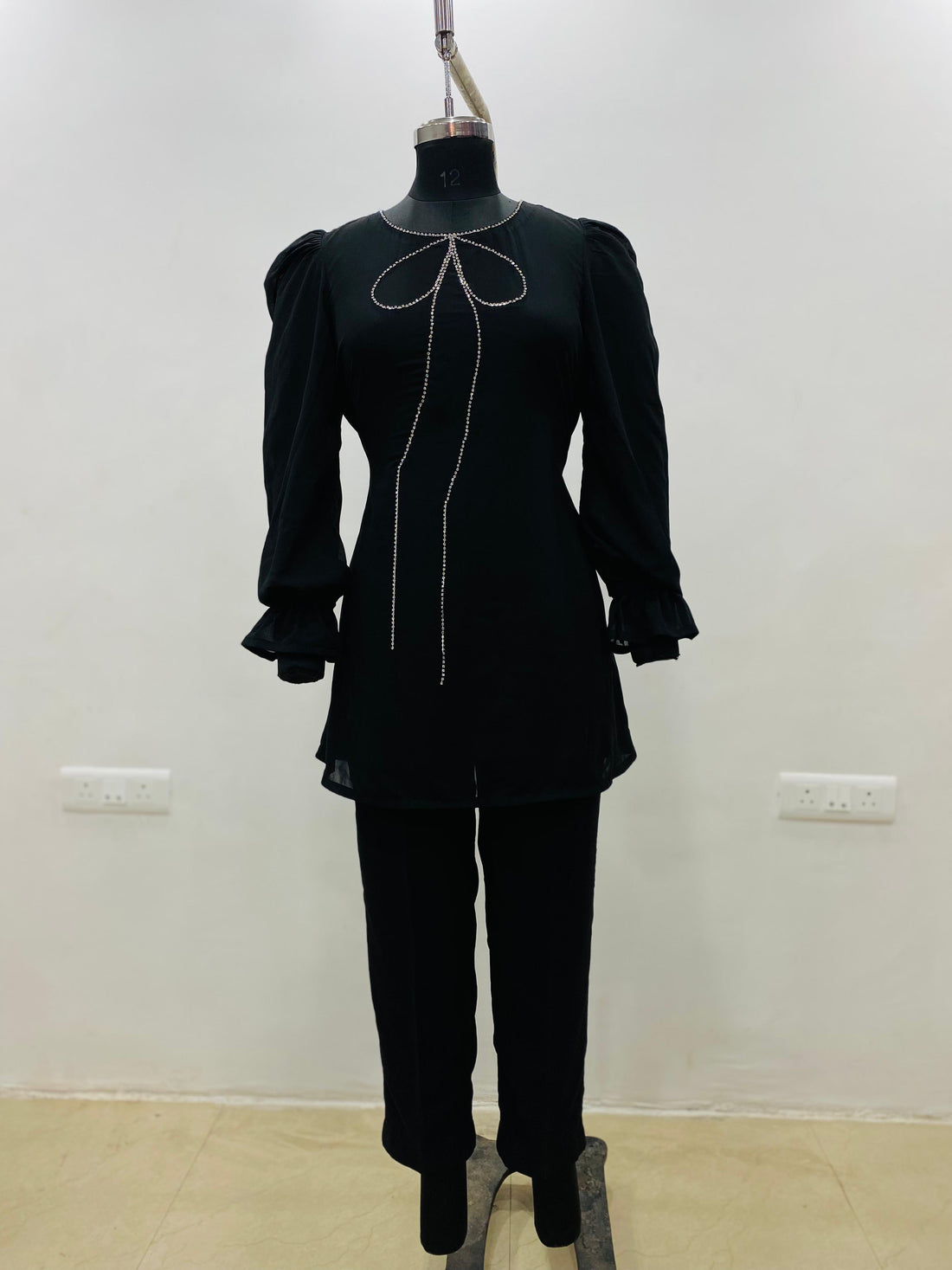 Description Black Bow Co-Ord 💙 featuring an elegant tunic adorned with a sparkling bow design...