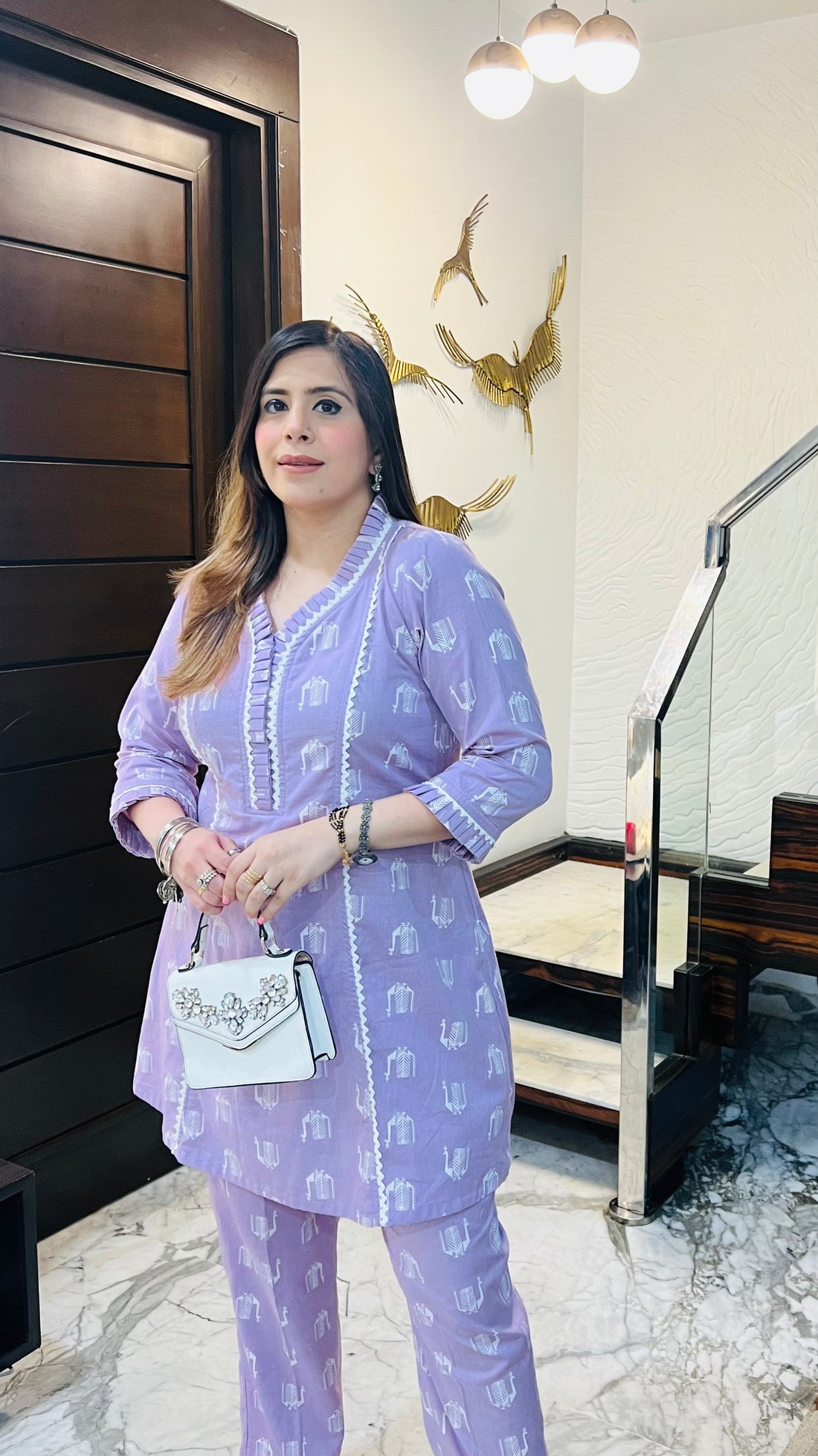 Description Bloom in elegance with the Lilac Floral Cotton Co-ord, where soft hues and delicate...