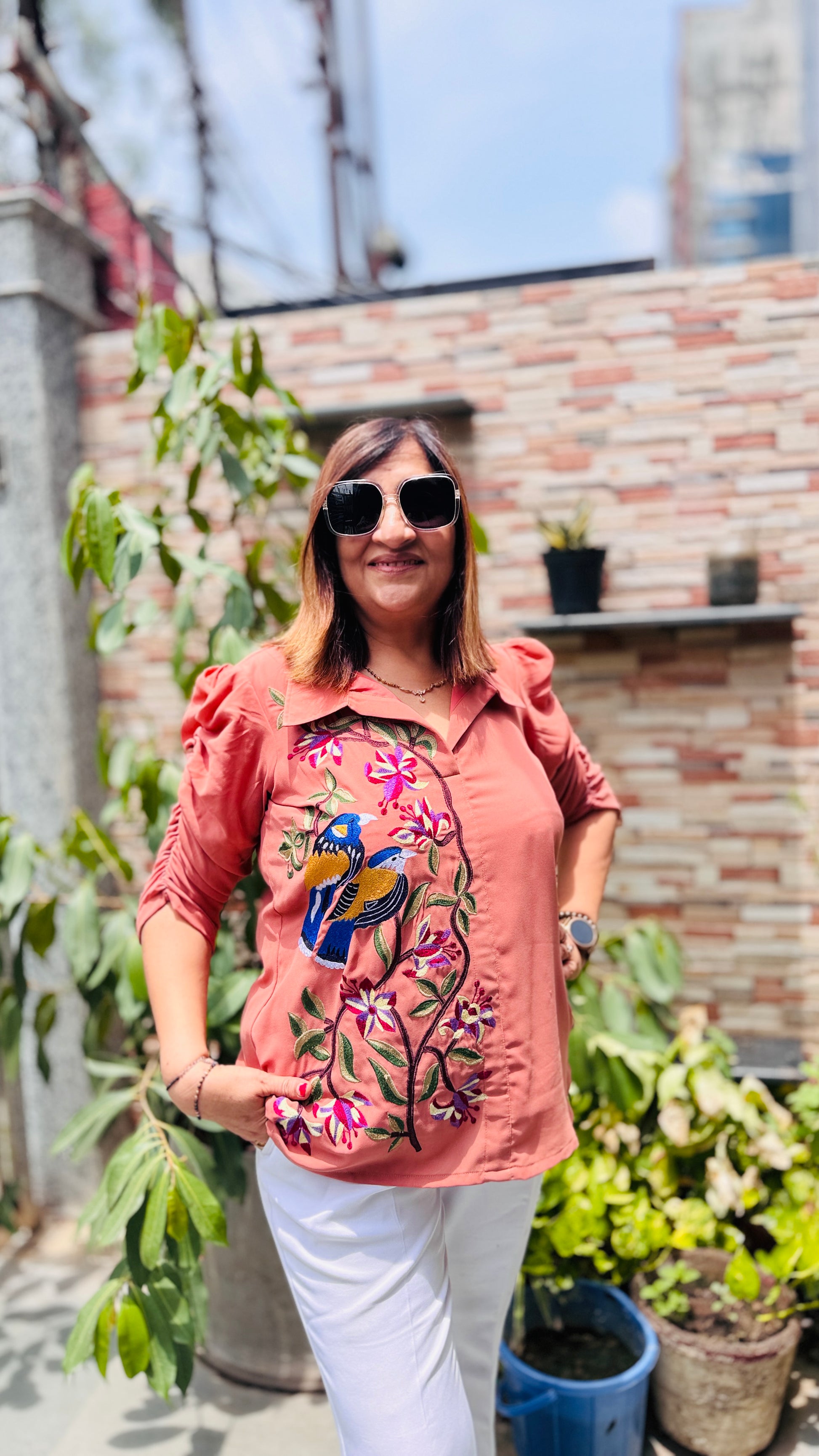 Brighten your day with this Peach Bird Shirt 🍑🕊️ Featuring stunning multicolor bird and floral embroidery, ruched sleeves, and a breezy fit—perfect for casual brunches or weekday chic! 😍👚🌿 |