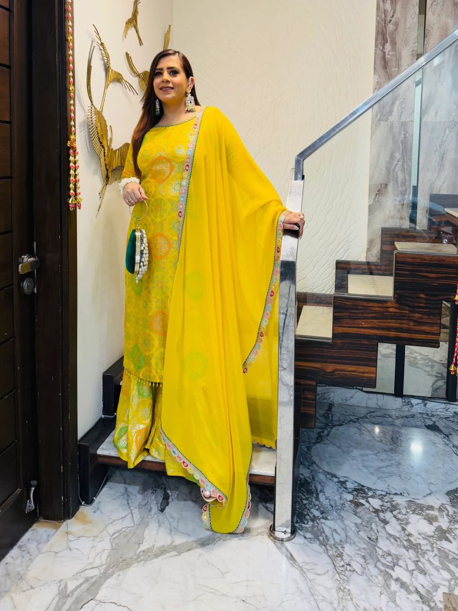 Description Elegant Yellow Haldi Garara Suit adorned with intricate gold and silver patterns ✨. Paired...