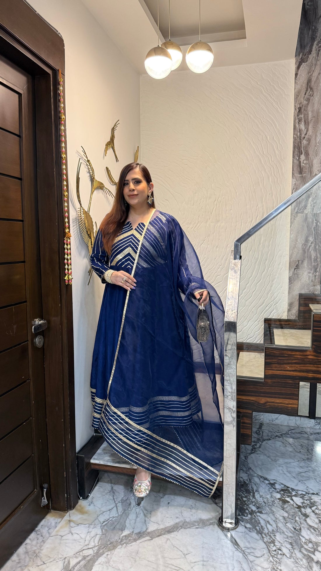 Description A dreamy sky-blue sequin Anarkali 🌸✨ with delicate lace sleeves and a flowy silhouette...