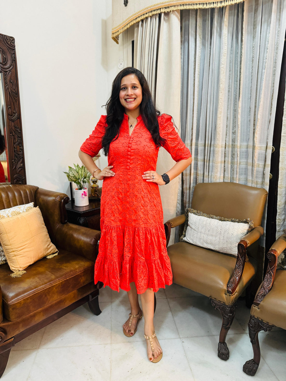 Description "Brighten your day with this vibrant orange Schiffli midi dress. Perfect for any casual...
