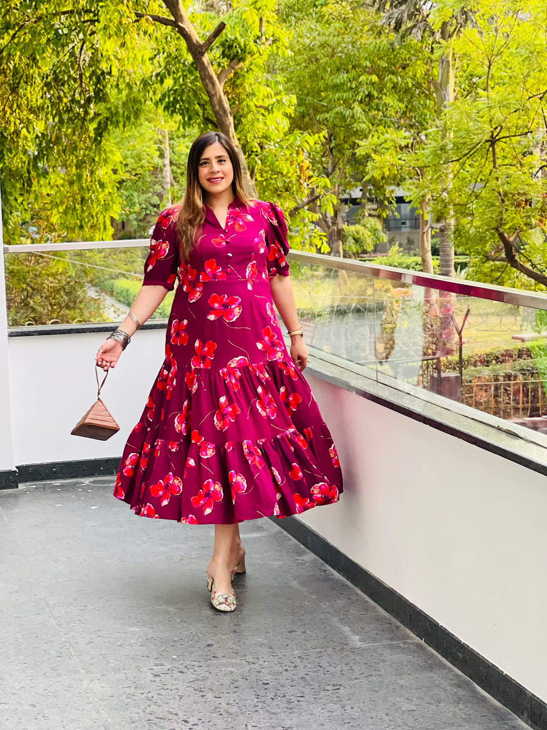 Description Embrace timeless elegance with our wine floral cotton midi Dress - a fusion of...