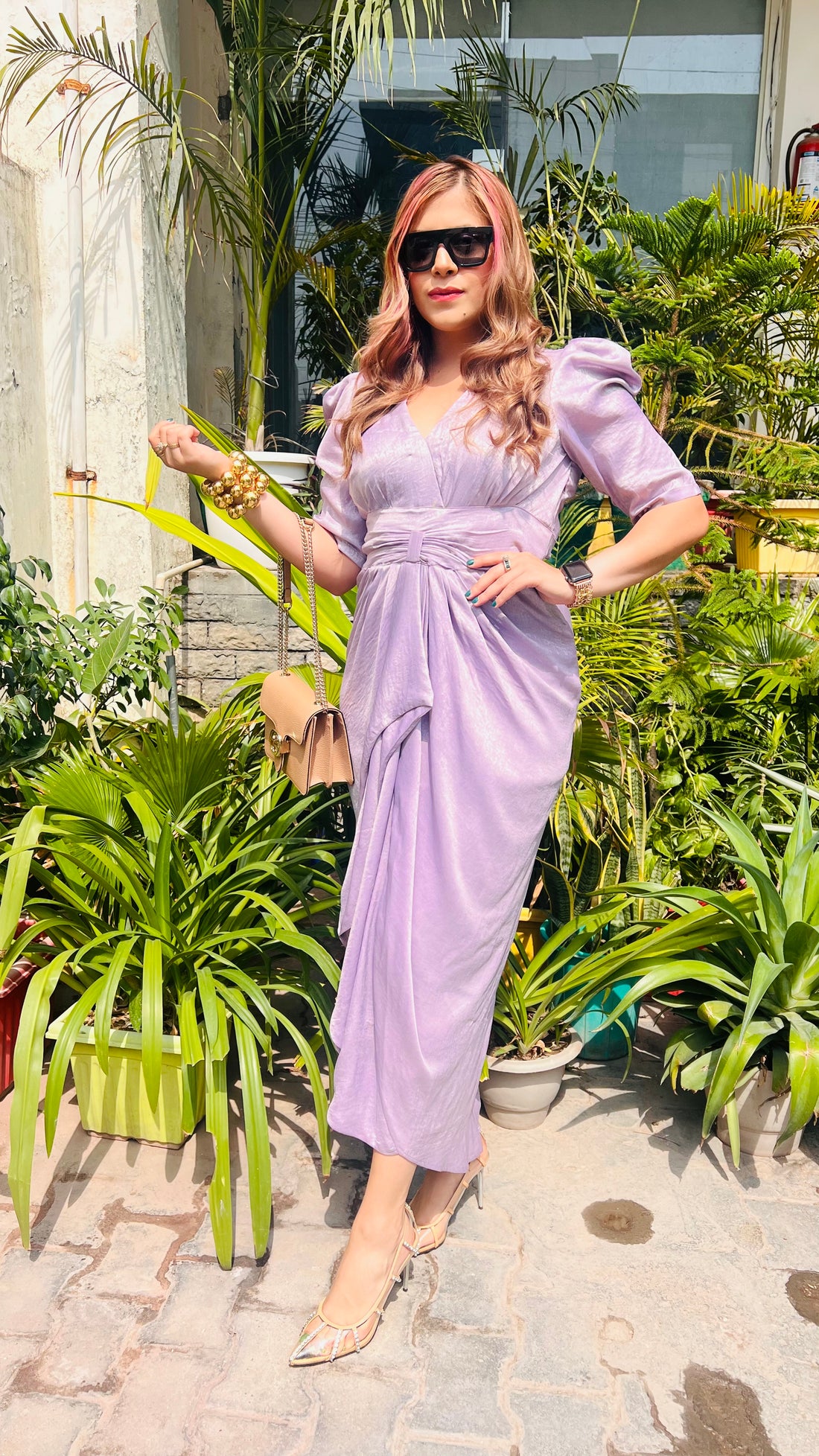Description The Violet Birthday Drape Dress 💜 is a satin midi delight featuring a soft...