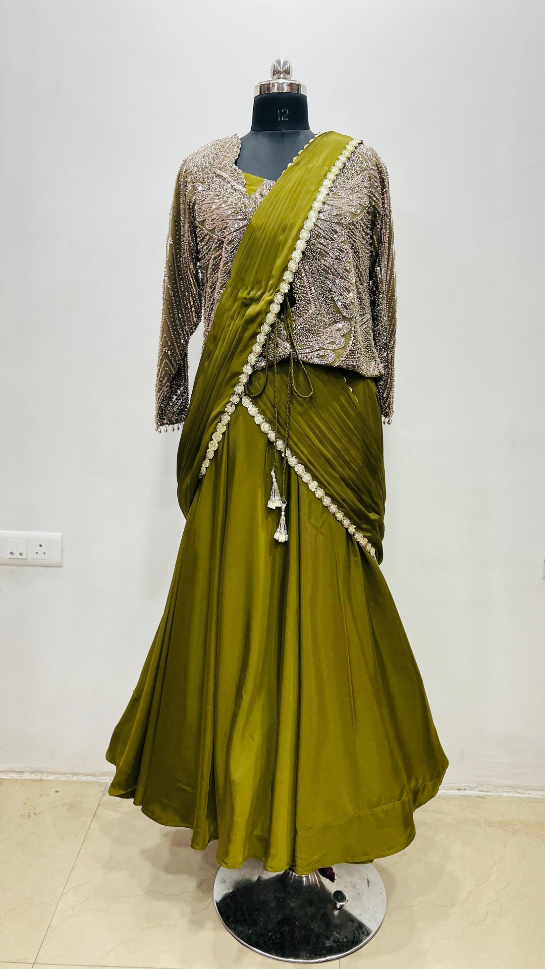Description This stylish Olive Green jacket saree combines traditional elegance with modern flair. Featuring...