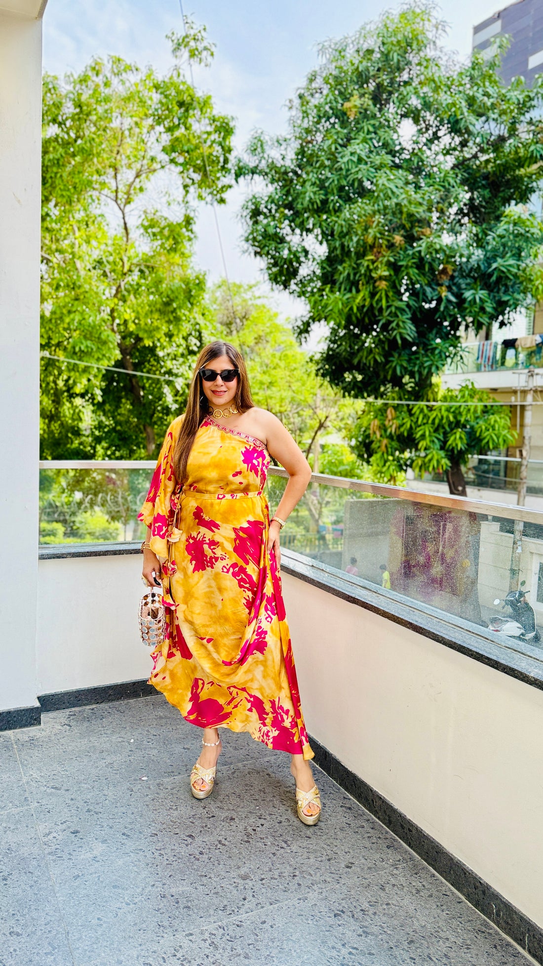 Description Step into the spotlight with our handcrafted one-shoulder kaftaan, drenched in vivid magenta with...