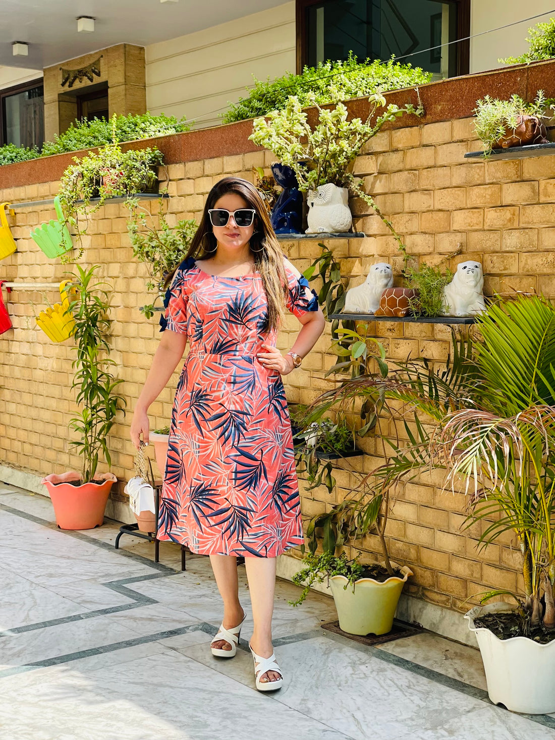 Description Effortless elegance in peach & blue 🍑💙 Embrace nature's beauty with this leaf-inspired midi....