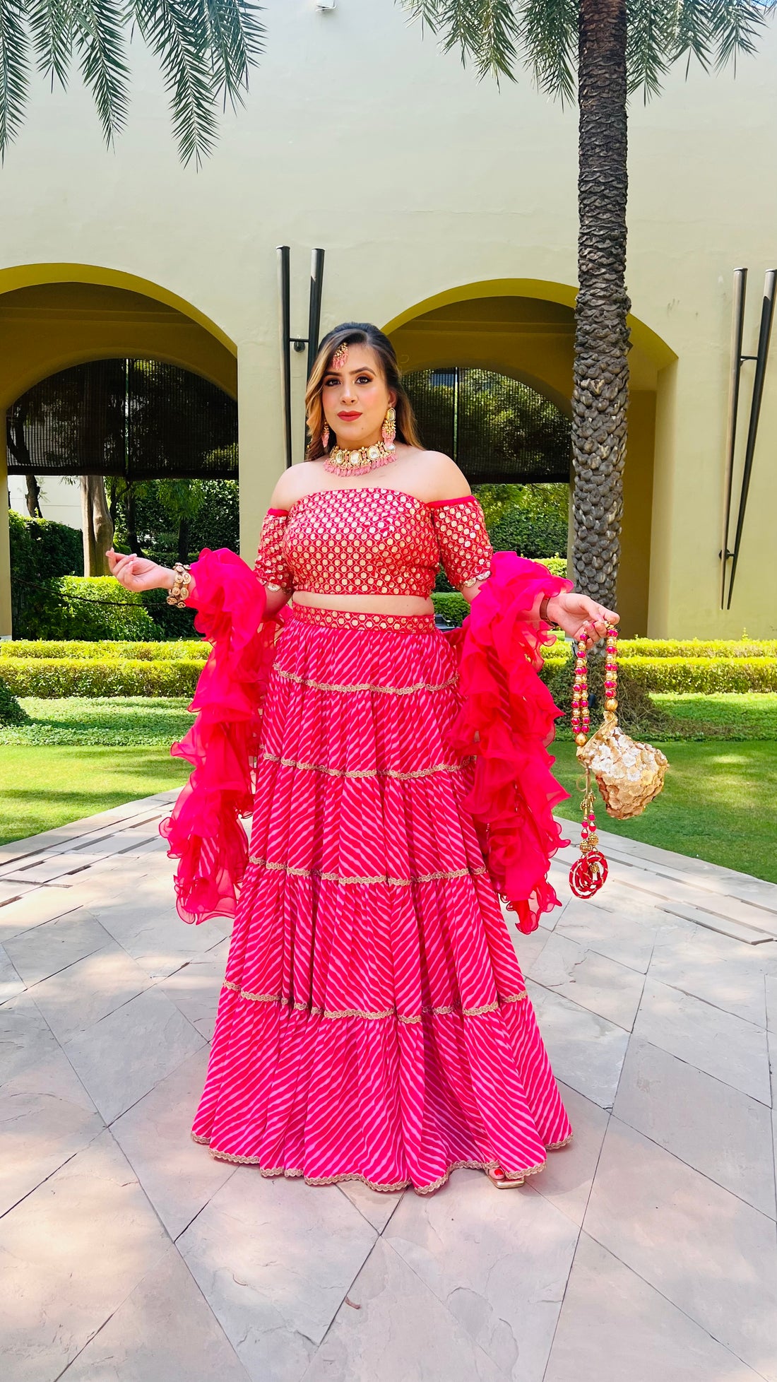 Description "Turn heads in the Red-Y Glow Fish Cut Lehenga! 🔥💃 With a flattering silhouette...