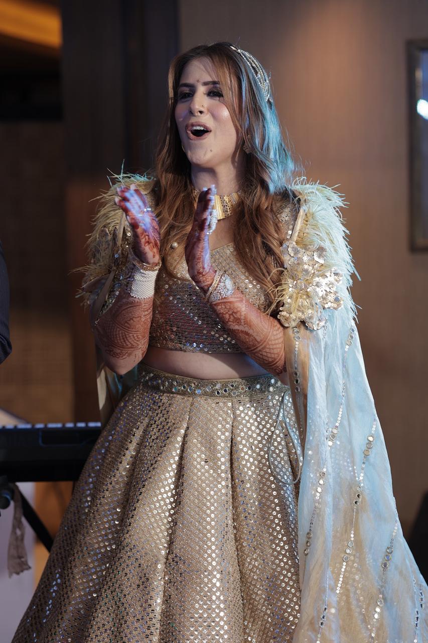 ✨ Golden Glamour Lehenga ✨ This breathtaking golden lehenga 💛 shines with sequin embroidery, feathered sleeves, and a regal cape 🪶, perfect for a royal bridal look 💫🌟. |