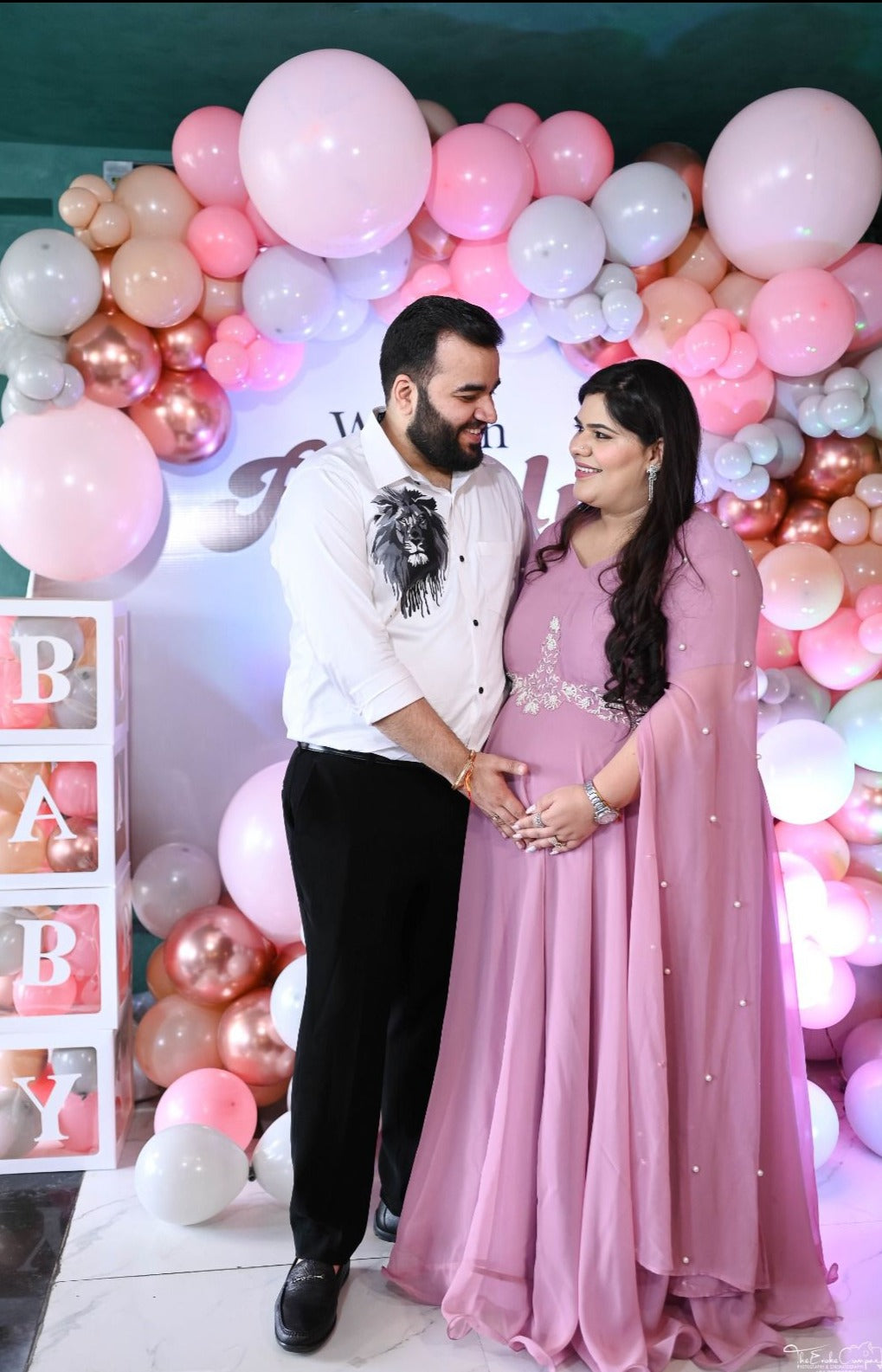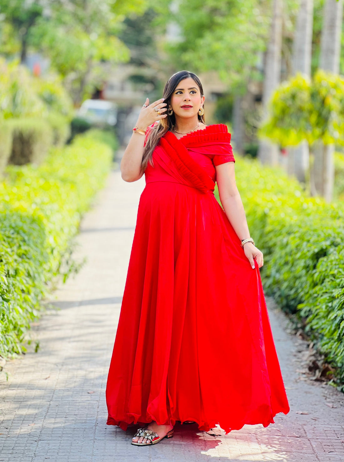 Description Blooming in red, this maternity gown celebrates the beauty of motherhood with elegance...