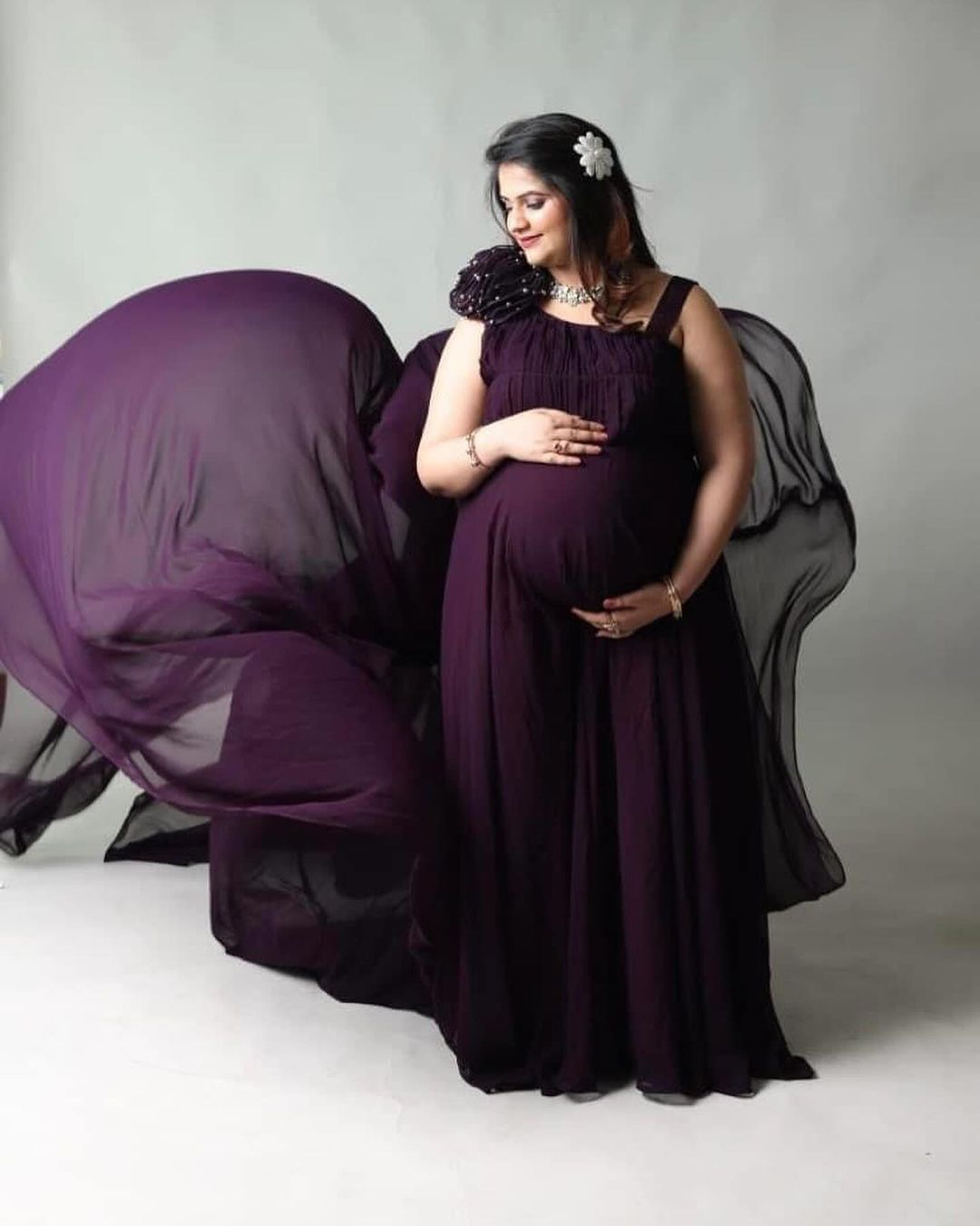 Description Dress to impress in the regal elegance of this Purple Mamma Gown, where sophistication...