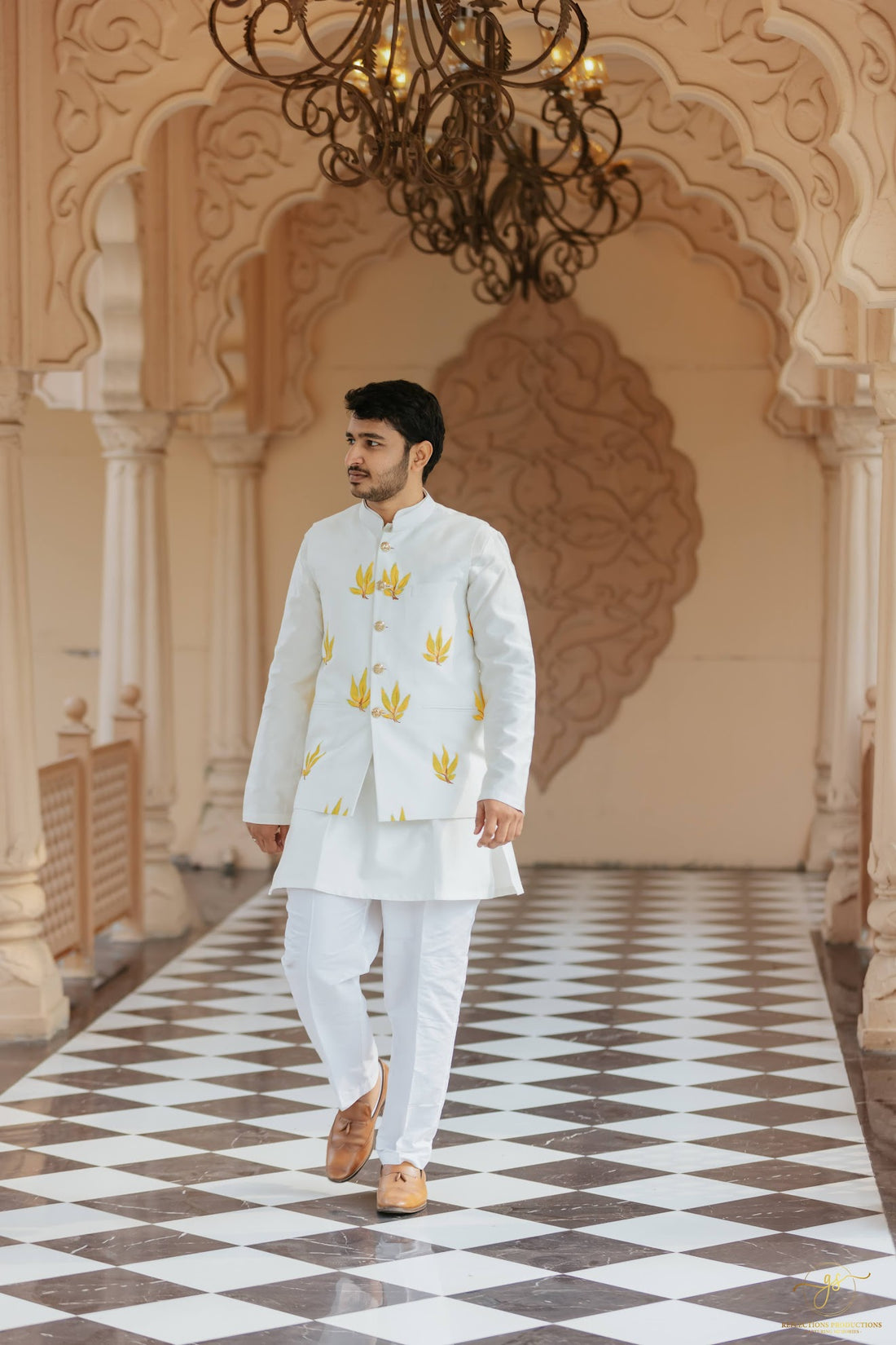 Description The Golden Leaf Hand-Painted Waistcoat exudes royal elegance ✨ with intricate golden leaf motifs...