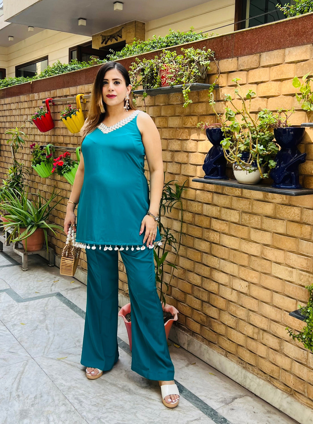 Description Stand out from the crowd in this vibrant teal green party co-ord, where bold...
