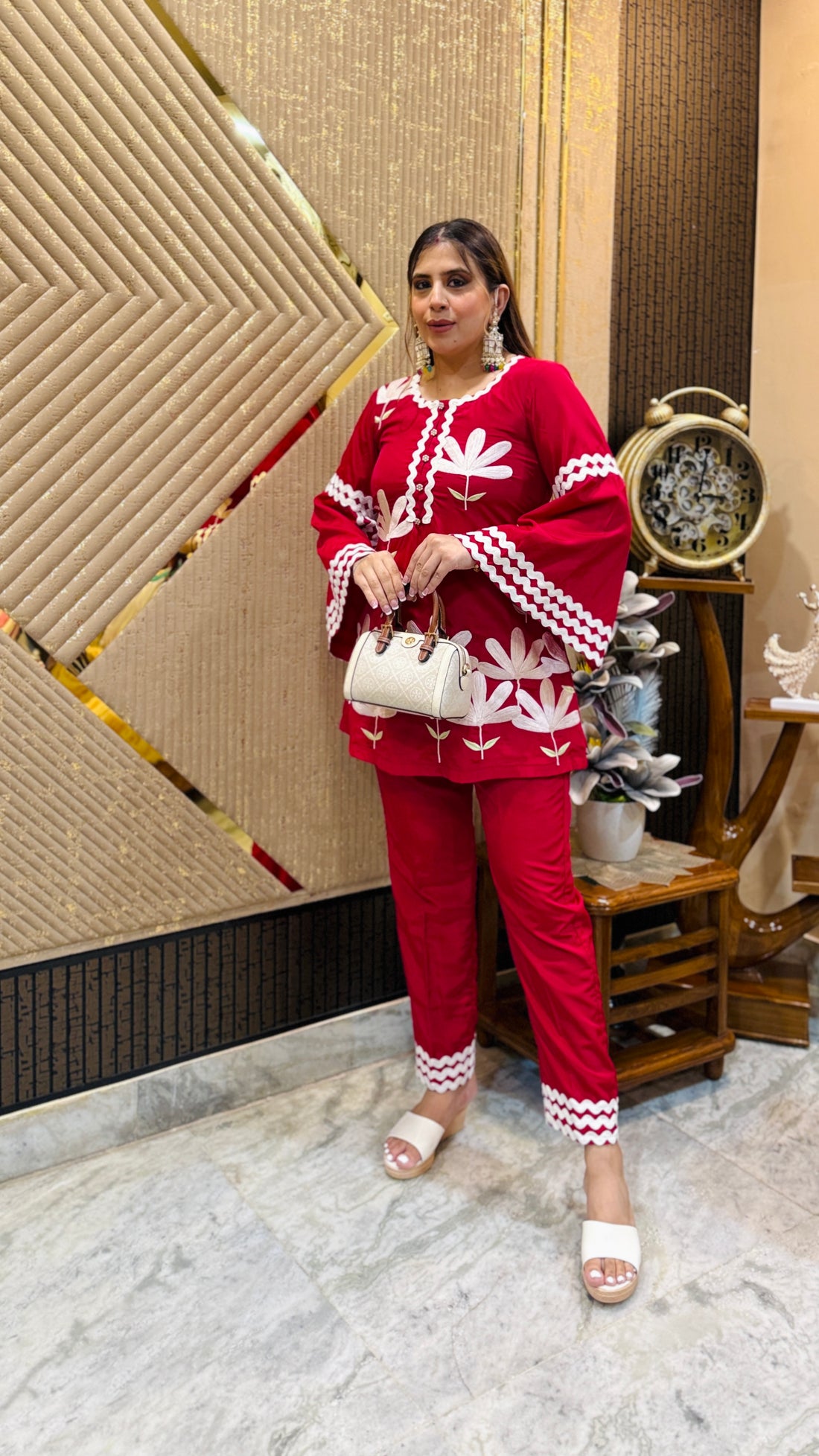 Description Chic ❤️ Red Diwali Co-Ord featuring floral white embroidery 🌸 on kurta with flared...