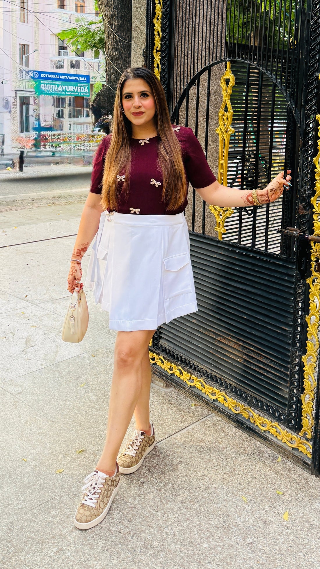 Description 🎀 Bow Down Skater Co-Ord 🎀Chic meets cute in this maroon bow-detailed top...