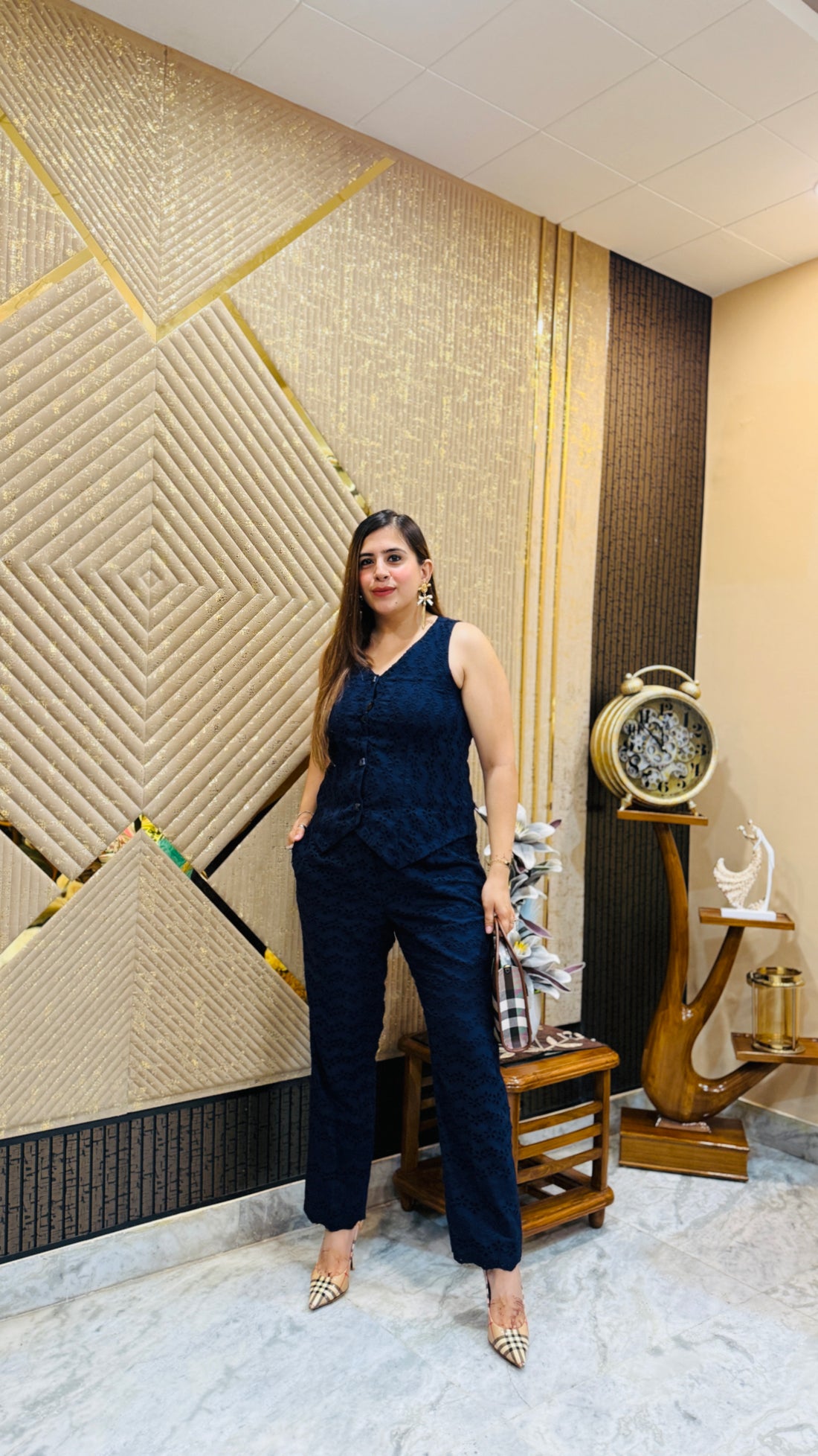 Description Chic navy blue Schiffli co-ord 💙 featuring a sleeveless waistcoat-style top with button-down front...