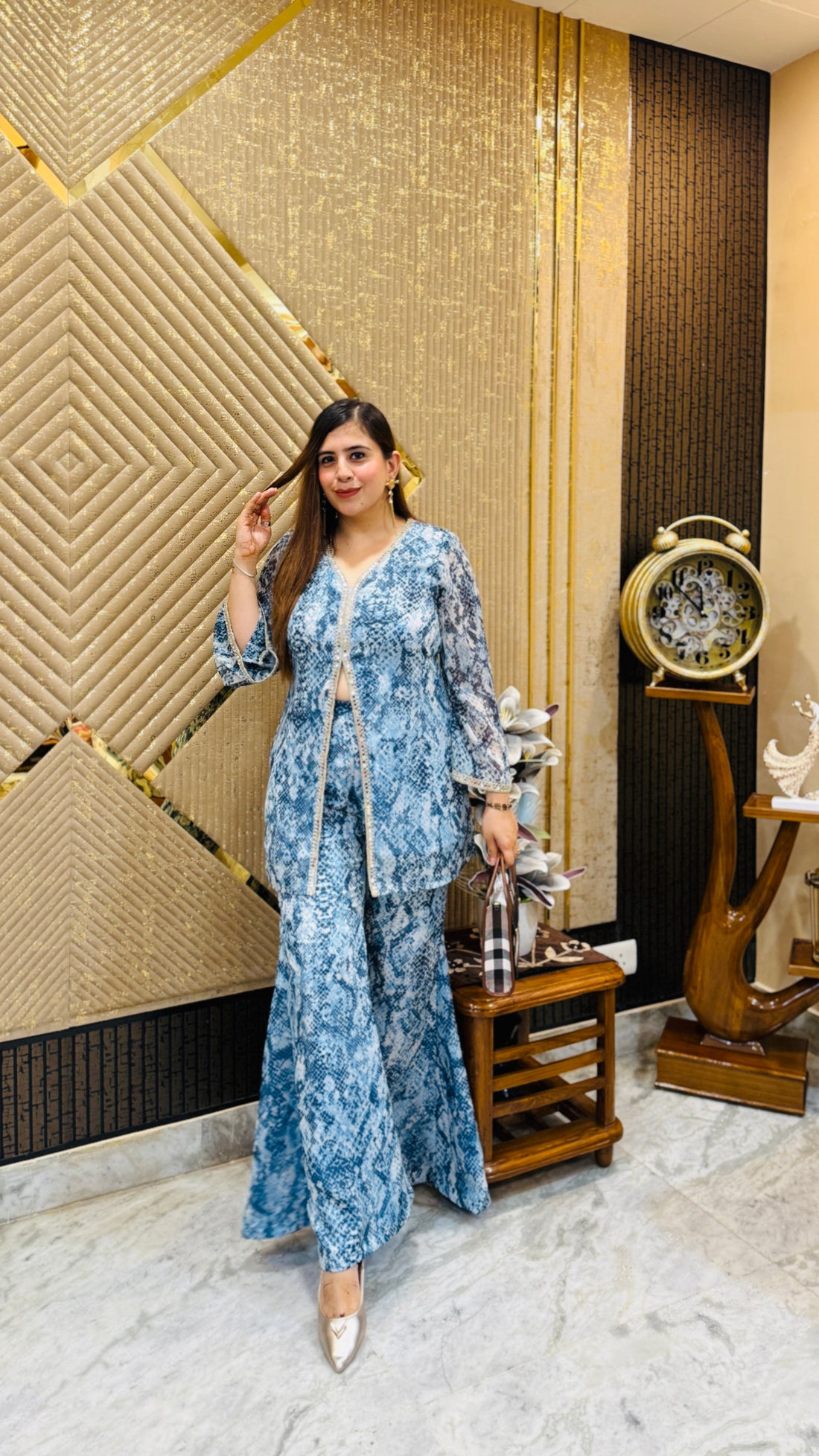 Description ✨ Elevate your Rakhi look with Vaishvi’s chic blue snake-print co-ord 🐍💙. Features a...