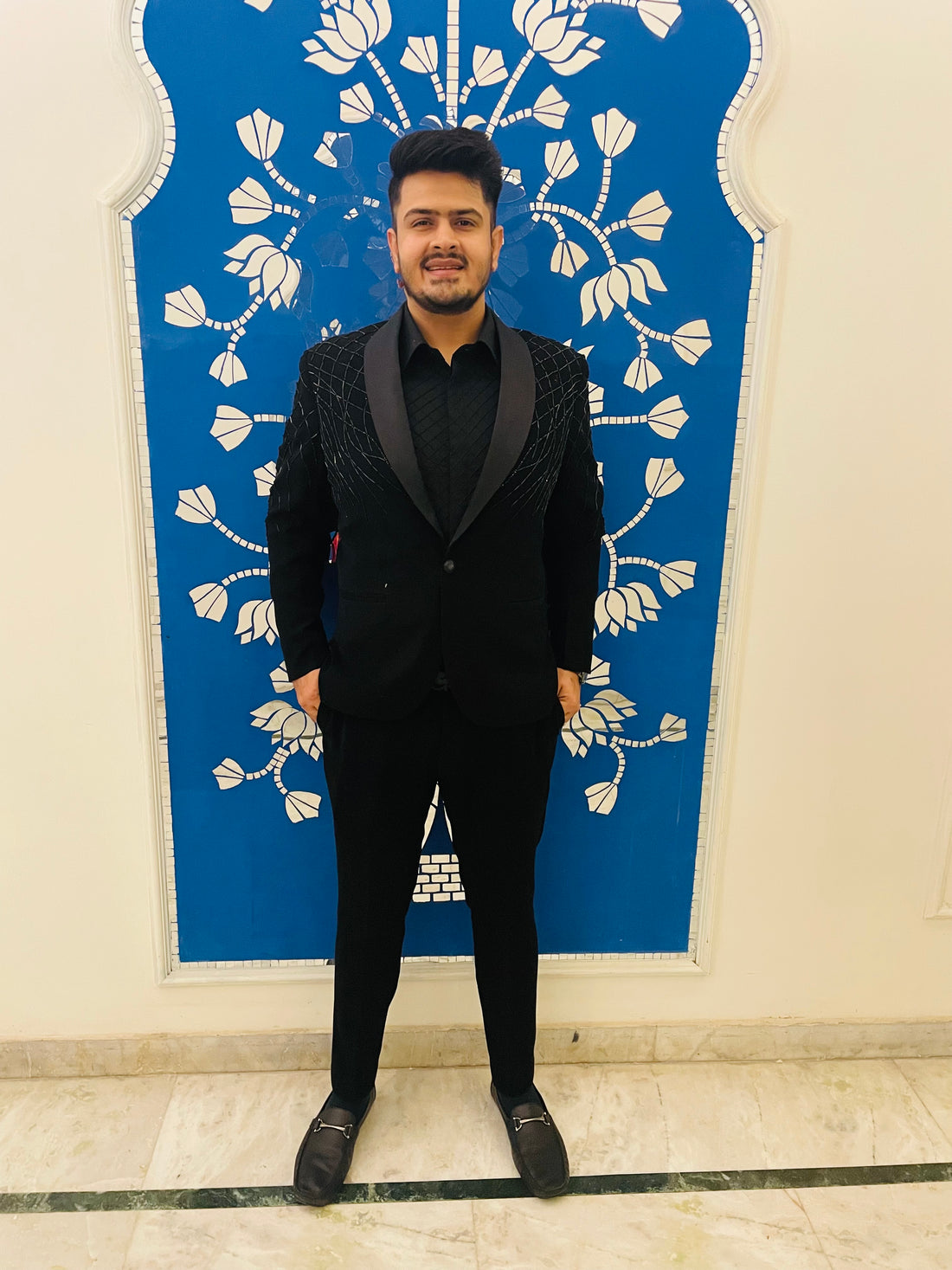 Description Crafted with precision, worn with pride: the allure of a well-tailored black embroidered suit."...