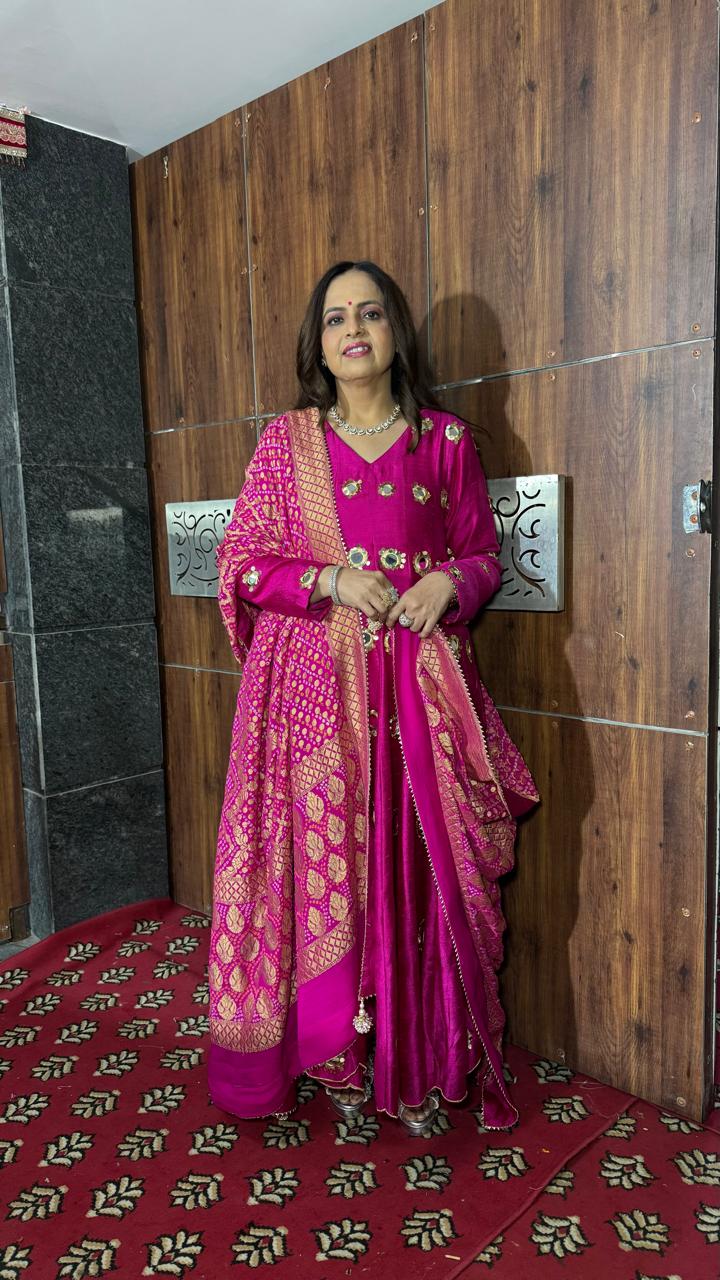 Description Graceful Jaipur ka Gota Winter Gown adorned with a Pink intricate neckline and sleeve...