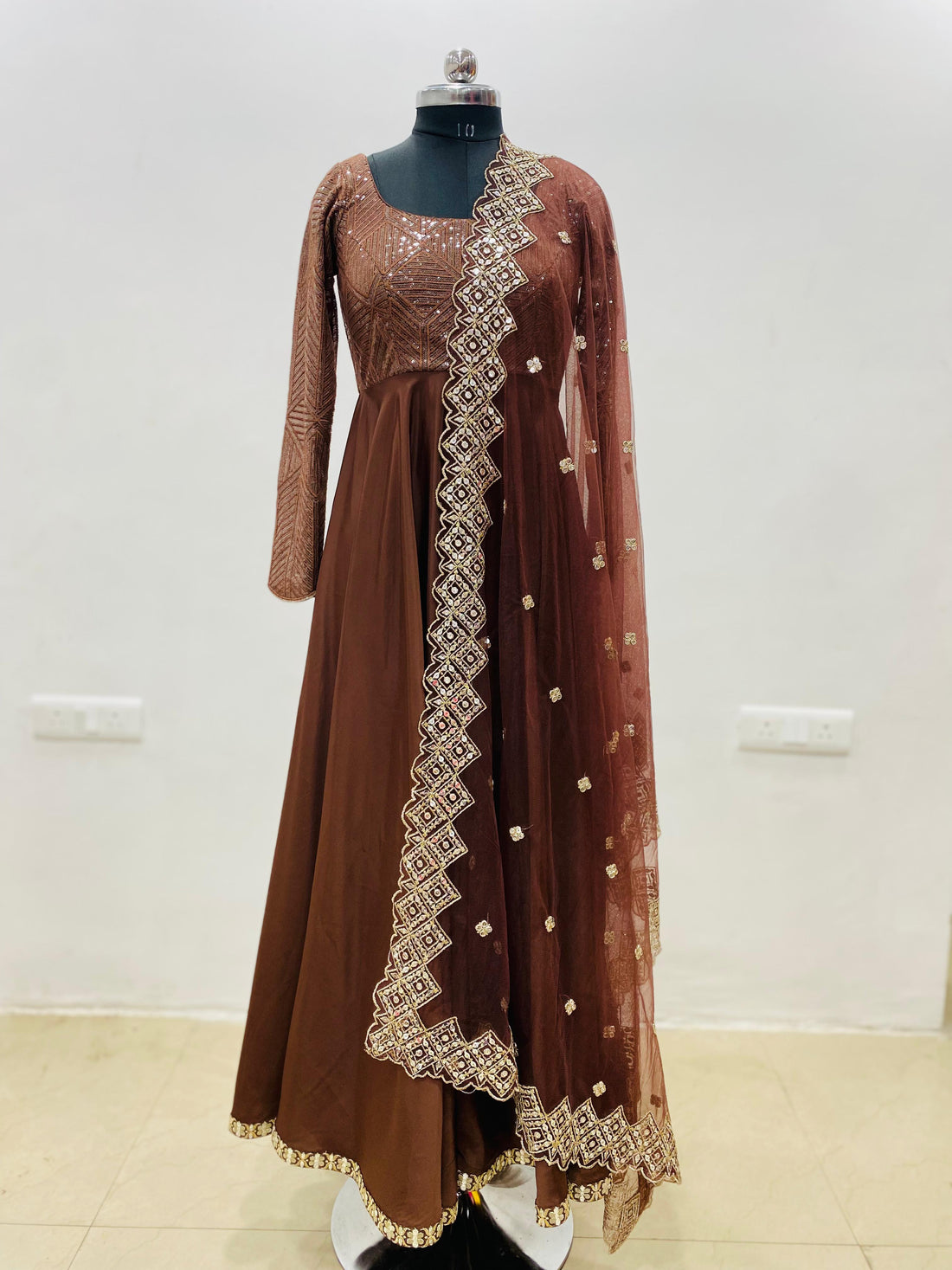 Description Chaandni Brown Anarkali ✨This rich brown Anarkali dazzles with intricate gold embroidery, sequined bodice,...