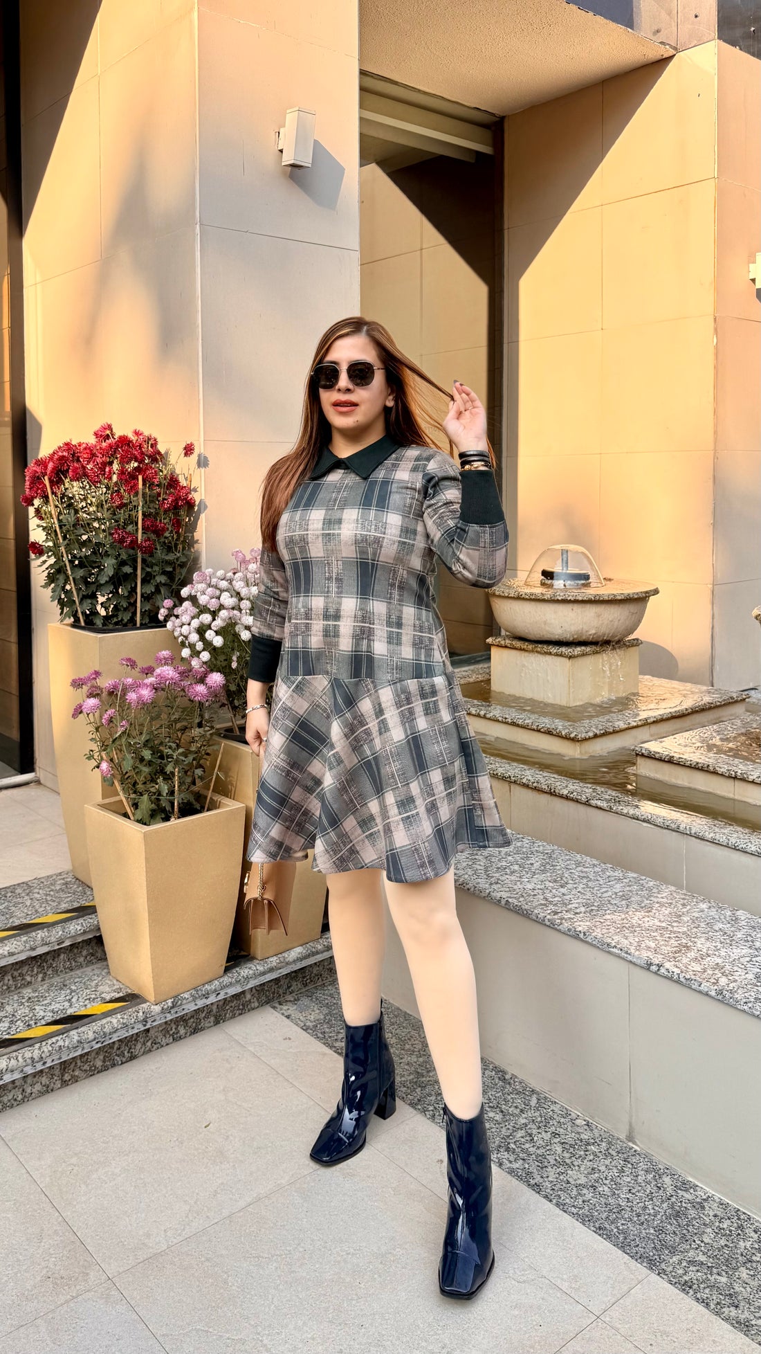 Description ✨ Dark Teal Suede Dress ✨A chic plaid dress with a flare hem and dark...