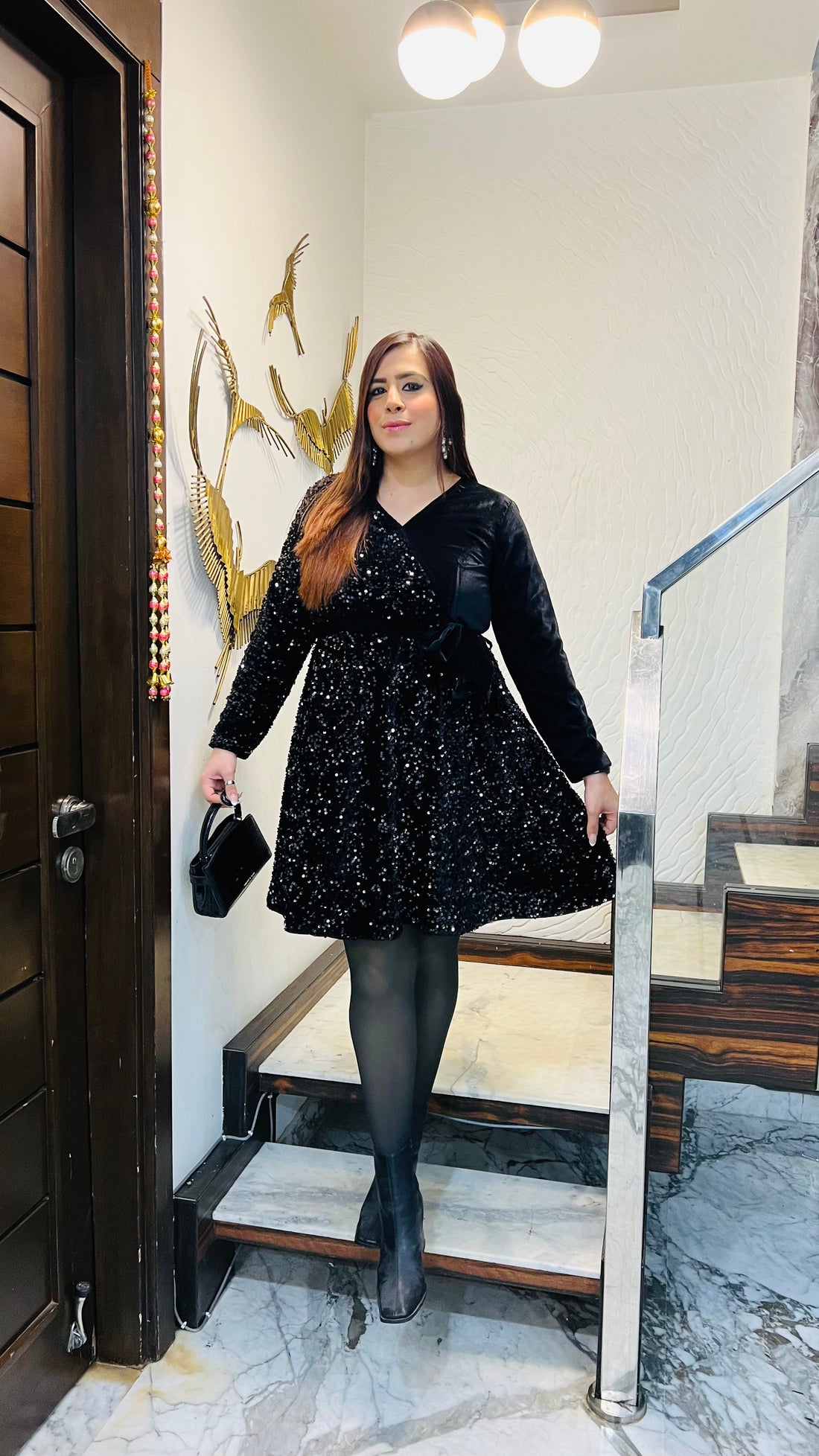 Description Stunning Devil’s black sequin dress with a velvet wrap bodice, flared skirt, and waist-tie...