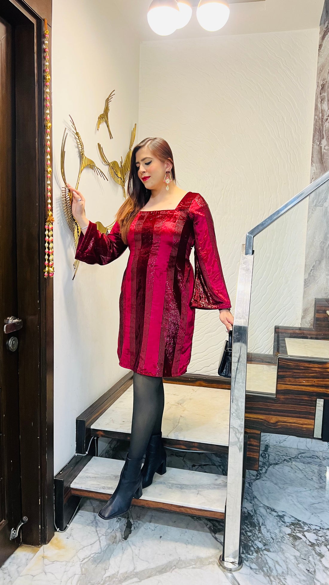 Description Elegant Maroon foil velvet dress with a square neckline, long flared sleeves, and shimmering...
